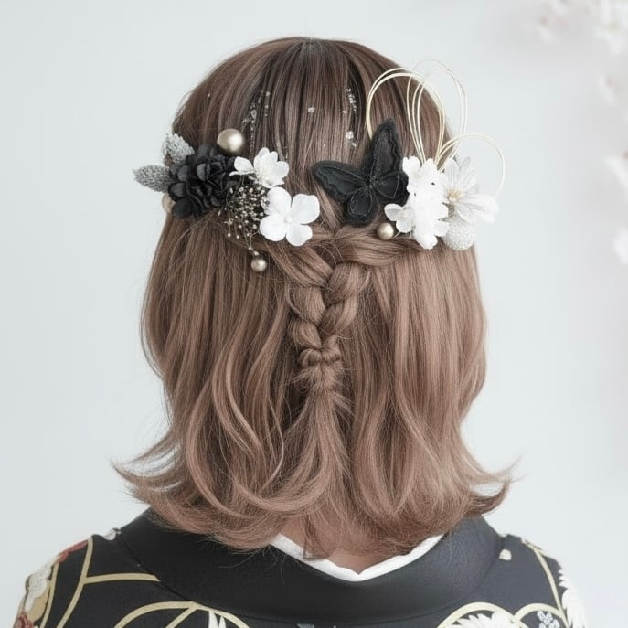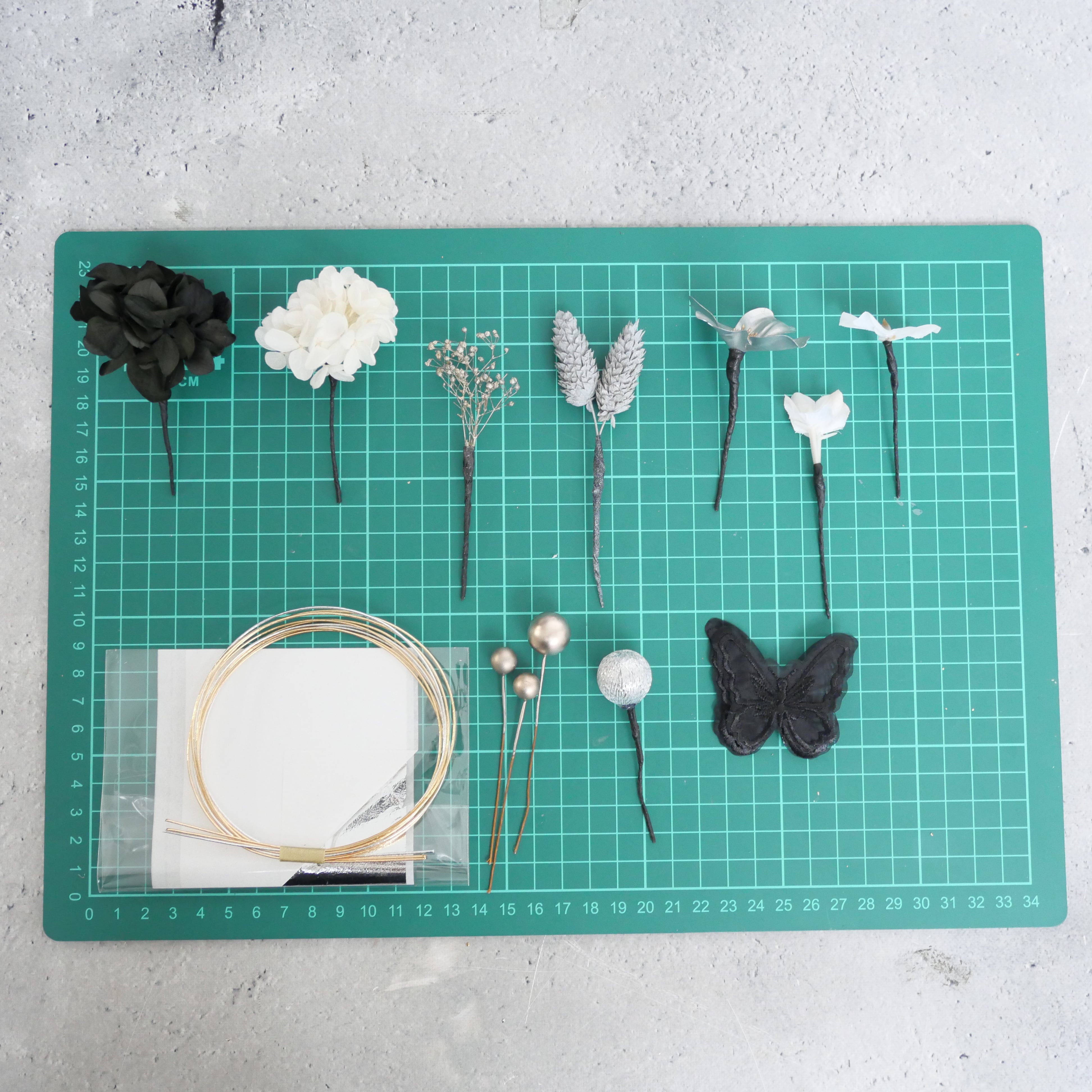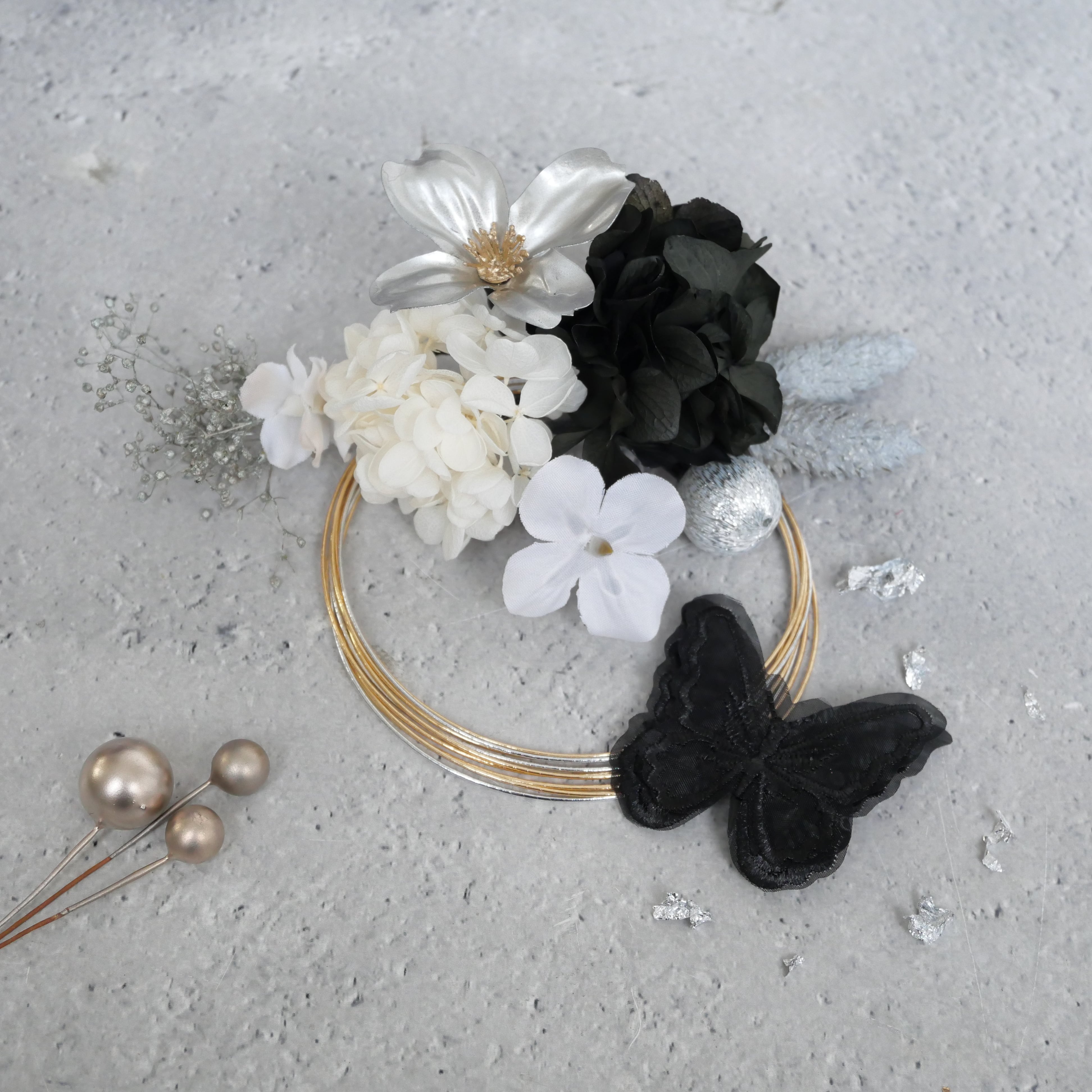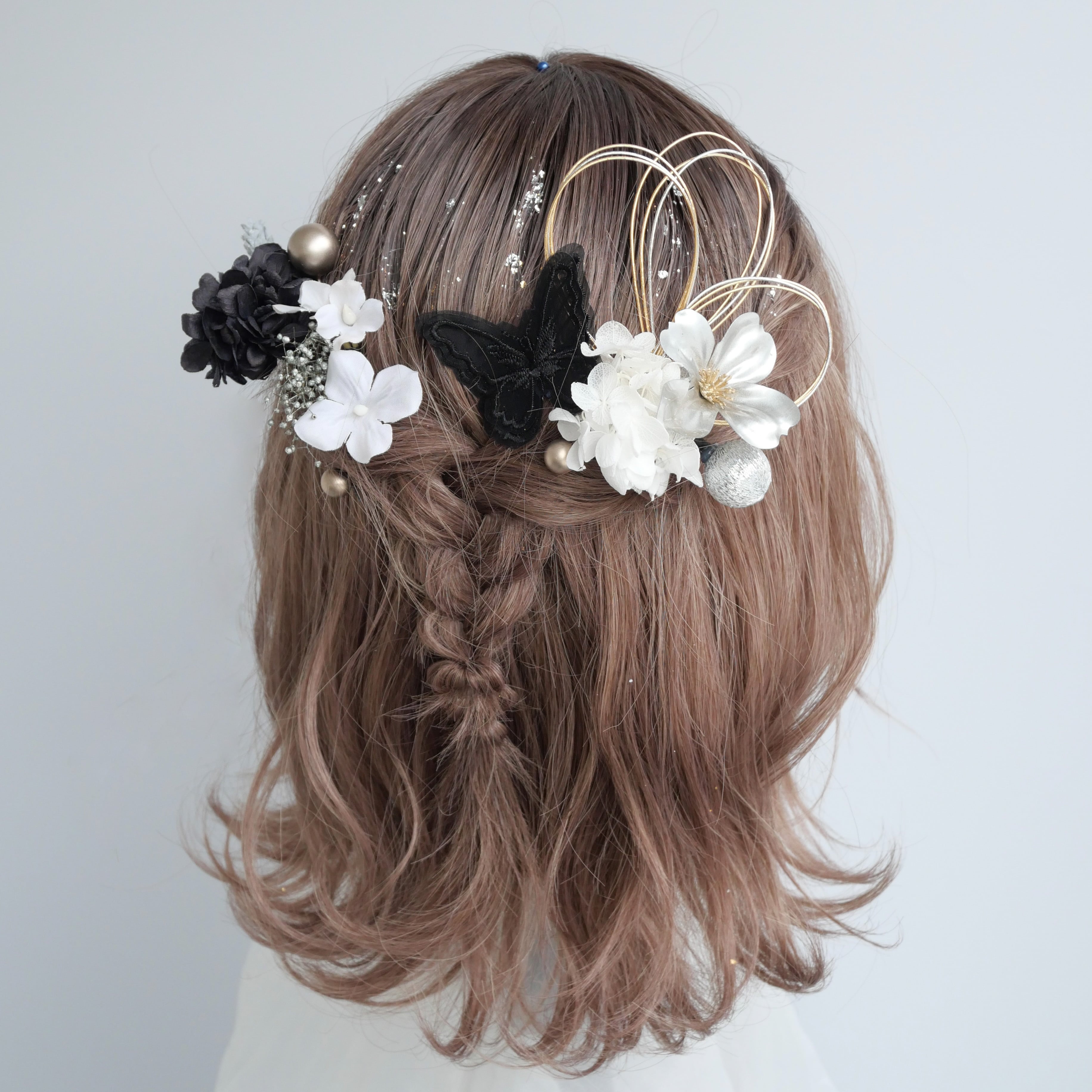 存在感のあるブラックの蝶モチーフを中心に、モノトーンのフラワーパーツや繊細なかすみ草を組み合わせ、甘さを抑えた大人っぽいデザインに仕上げました。ブロンズの水引とブロンズの和玉が程よい華やかさをプラスし、上品な輝きを演出します。