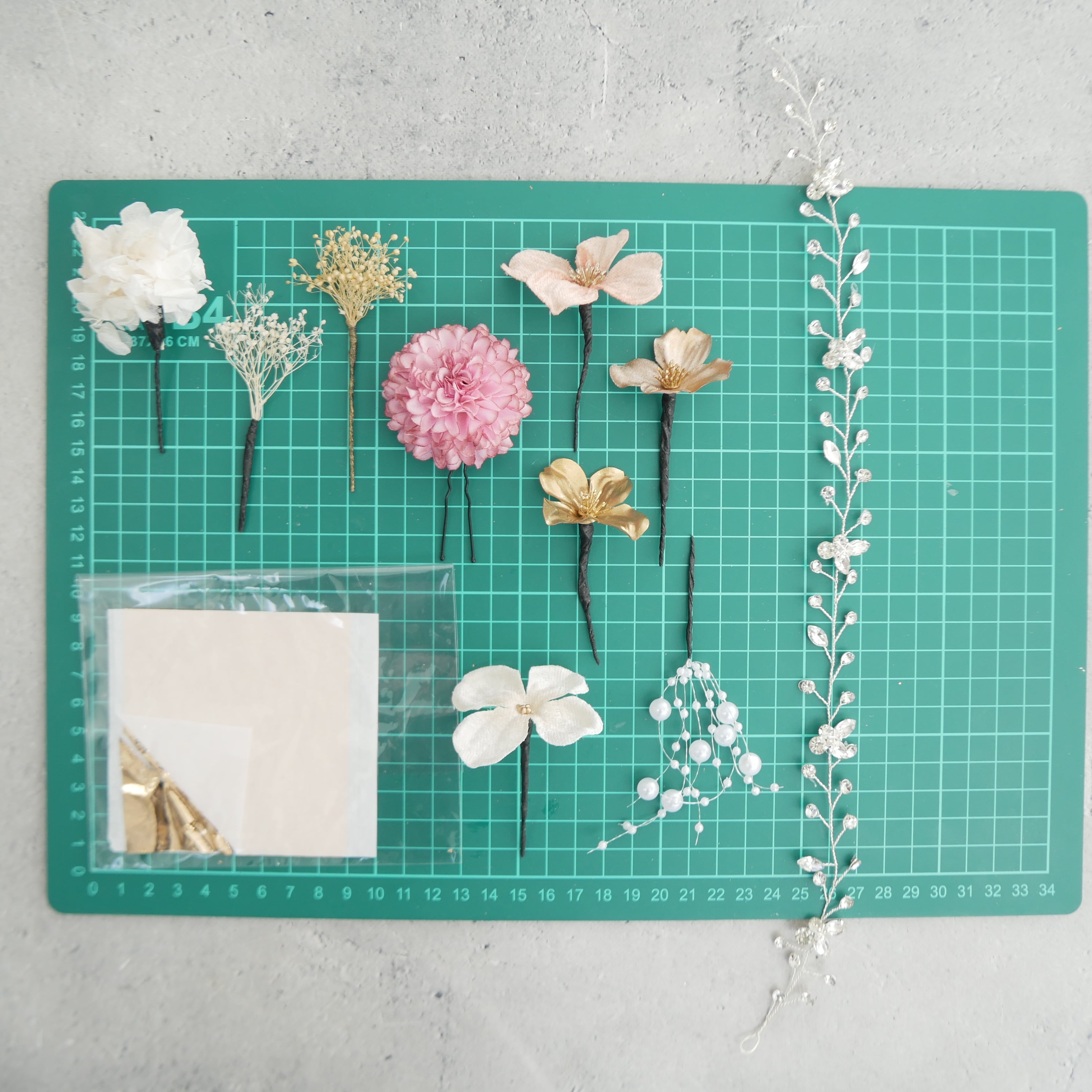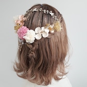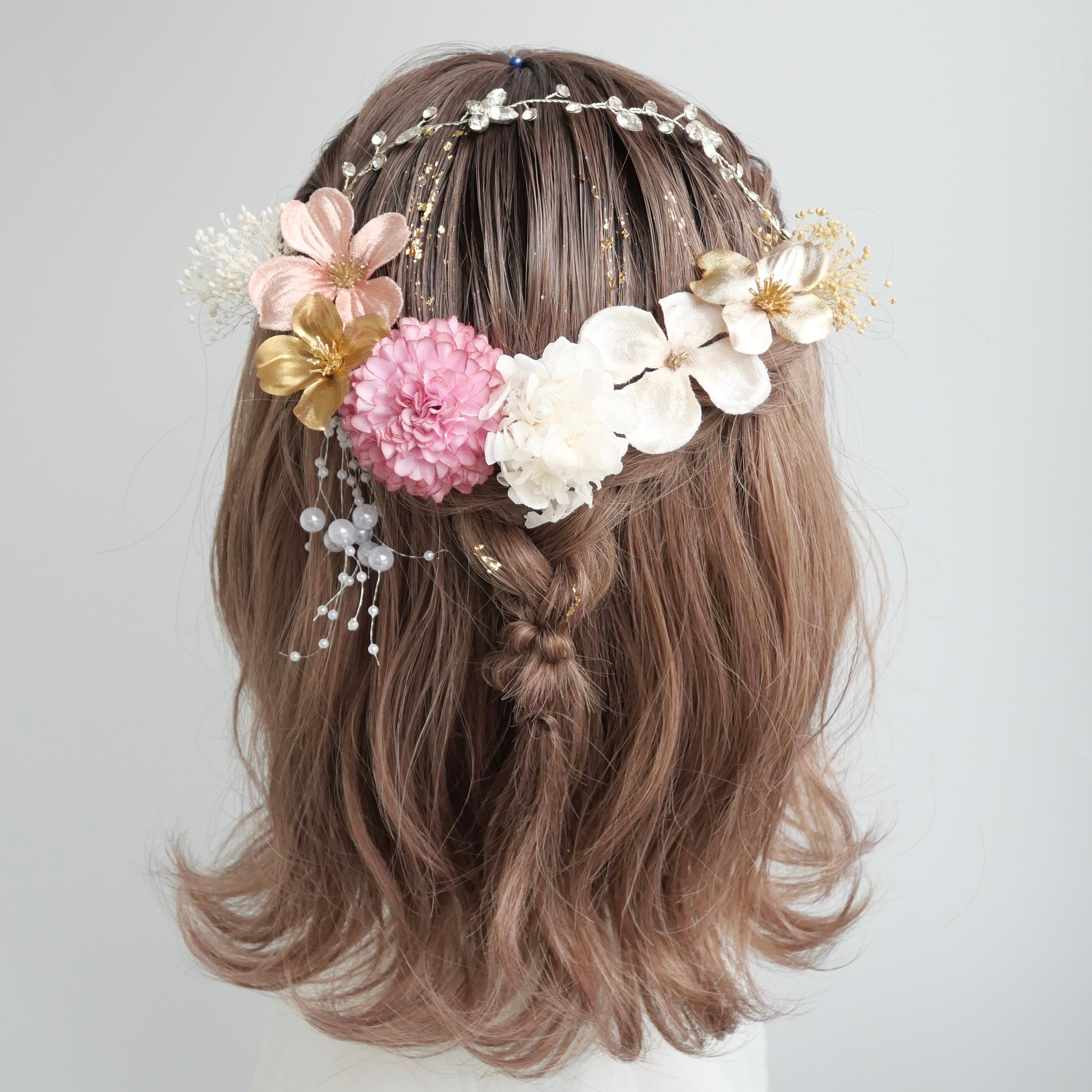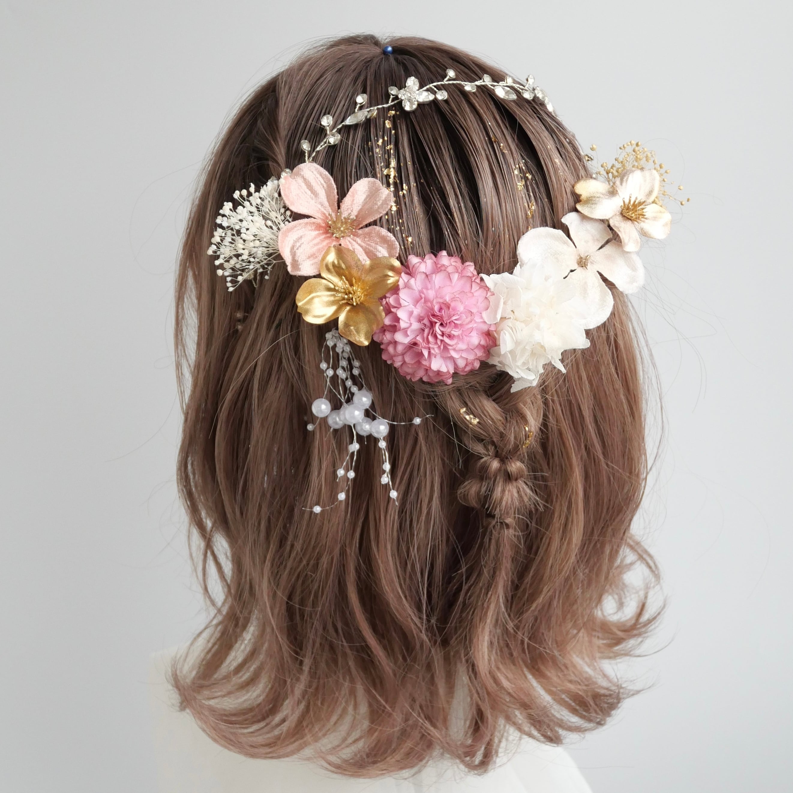 淡いピンクやホワイト、ゴールドを基調に、繊細な小花・パールをバランスよく組み合わせました。後ろ姿をぐっと華やかに見せながらも、派手すぎず大人っぽい印象に仕上がります。