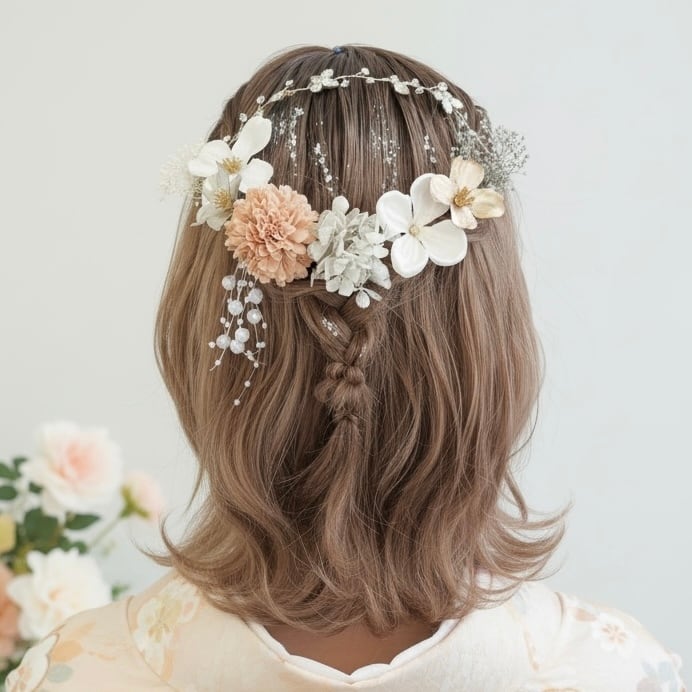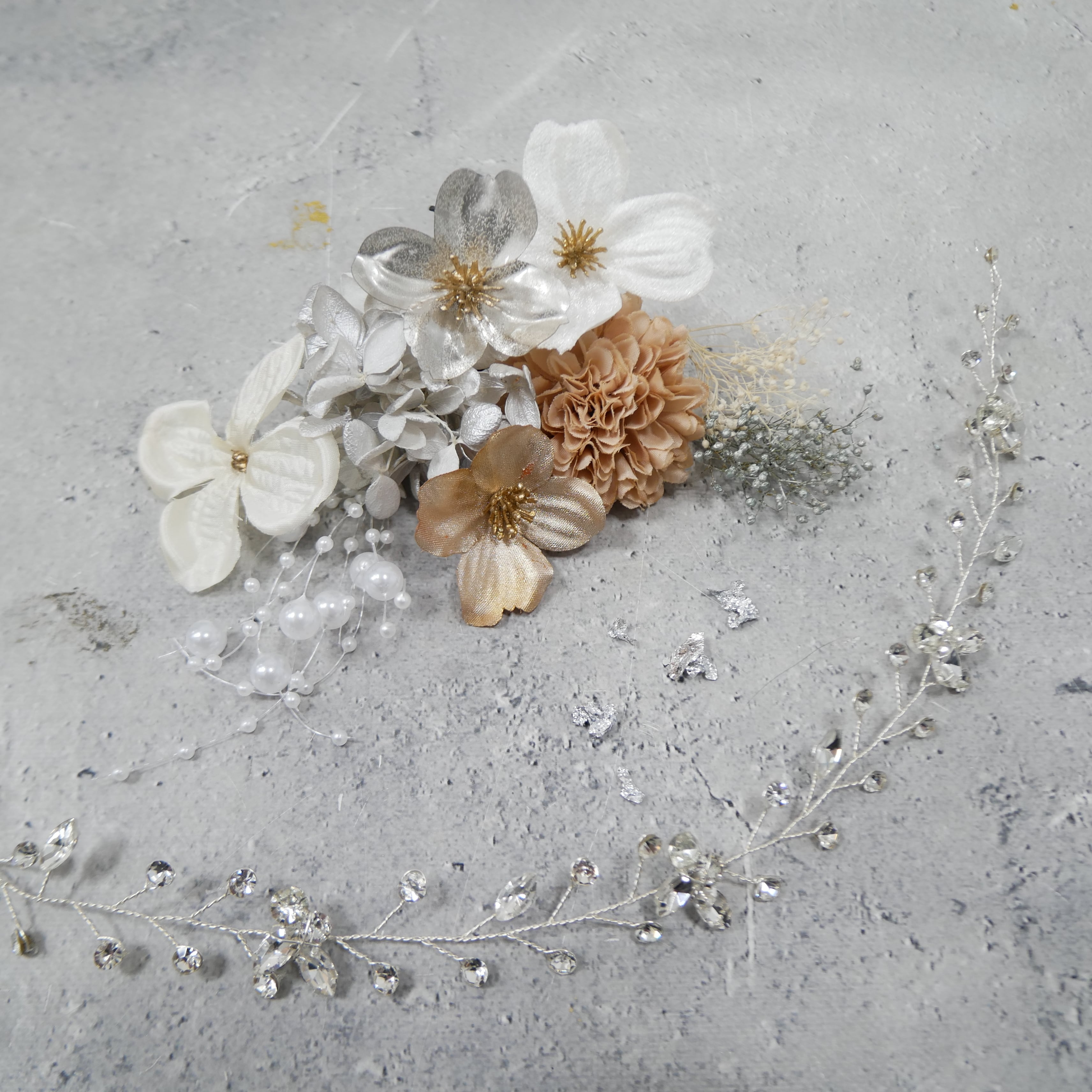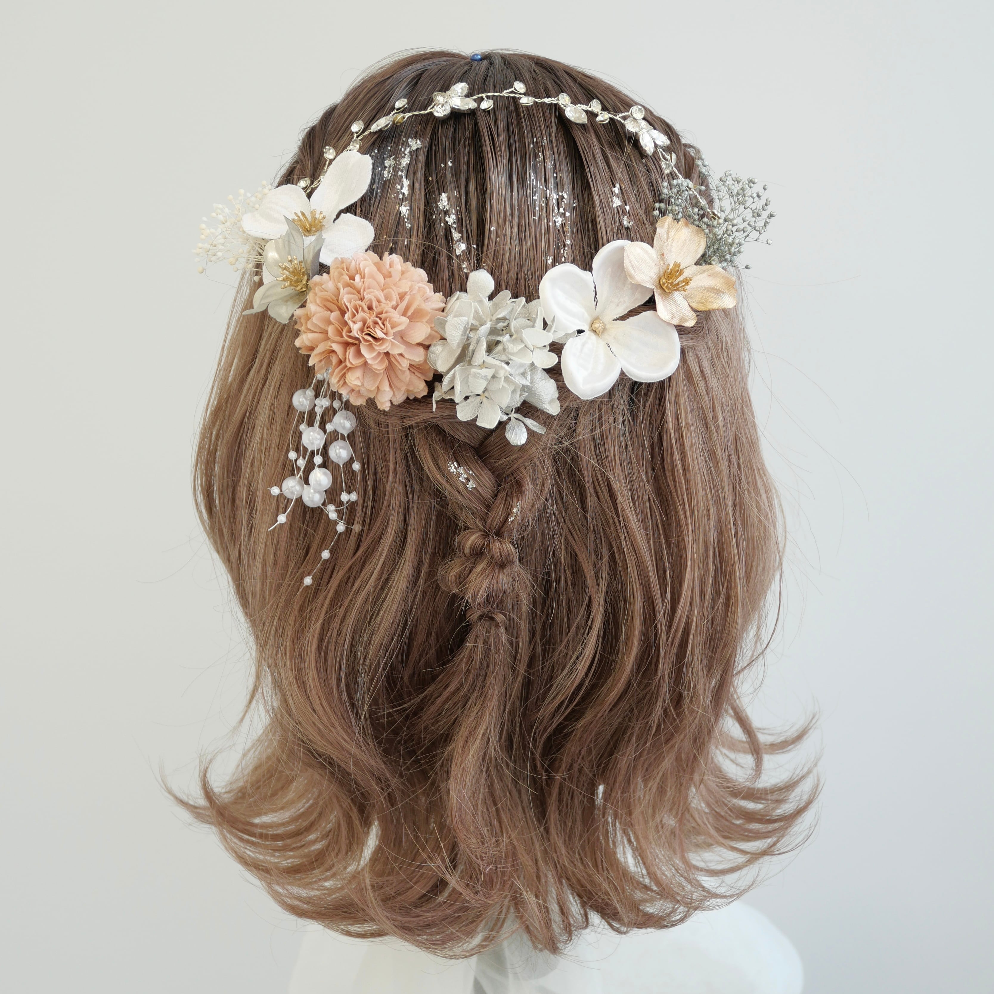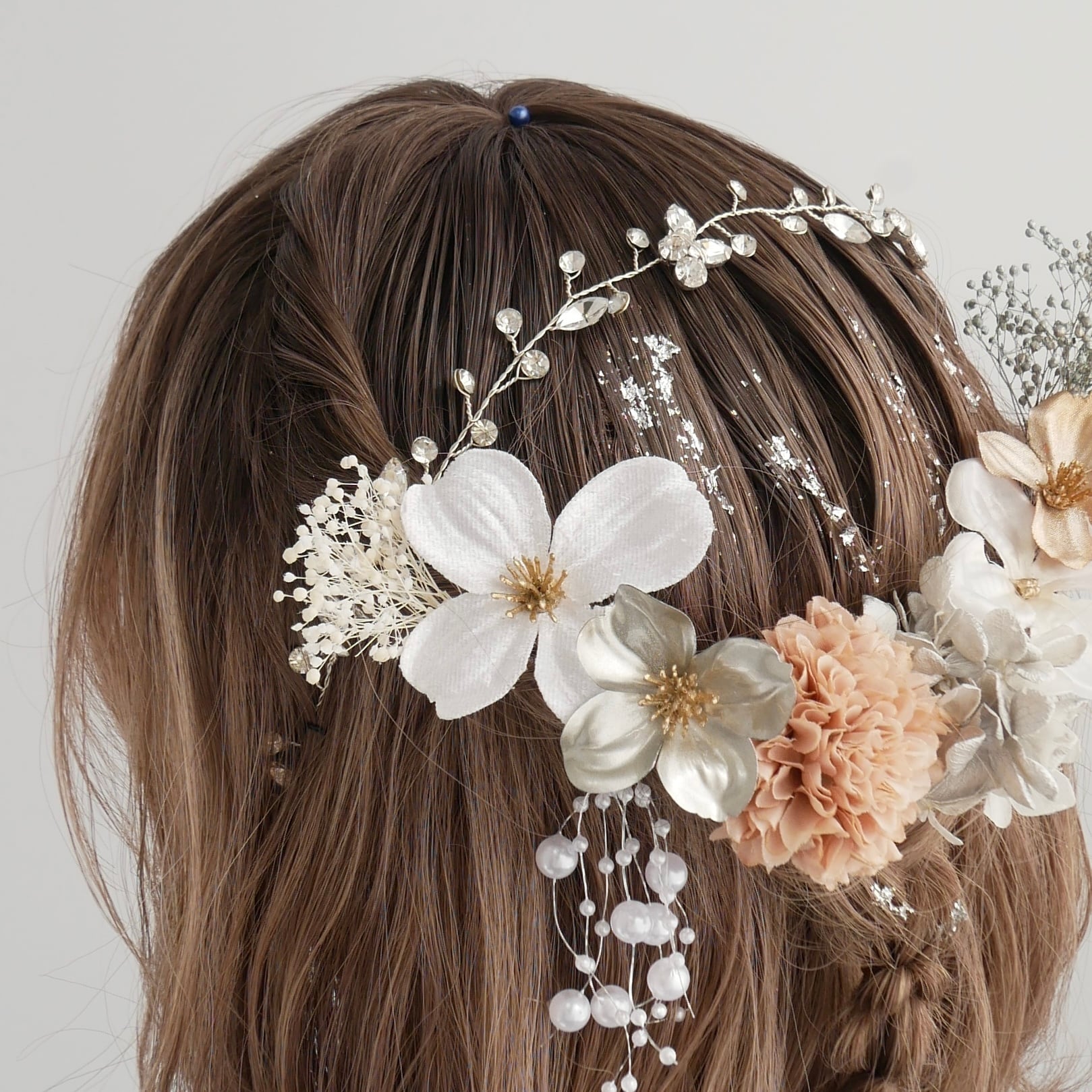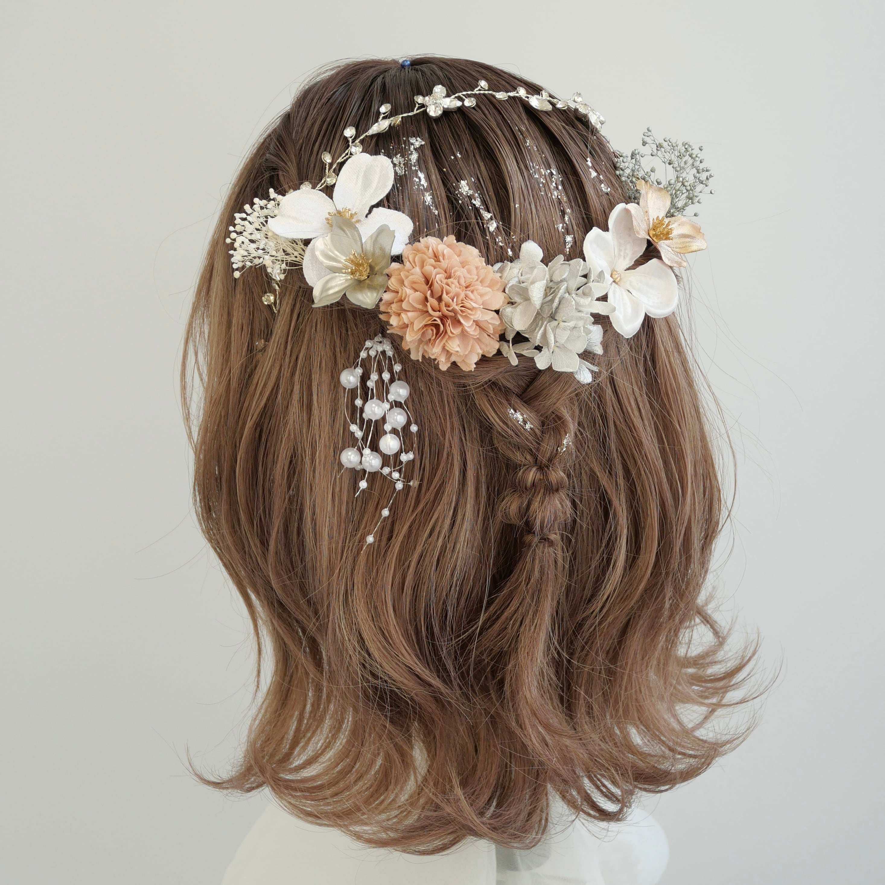 ふんわりと咲くピンクベージュのマムを主役に、ホワイトフラワーとさりげないシルバーを添えて、大人可愛い印象に仕上げました。繊細なかすみ草やパールチェーンが動くたびに揺れ、後ろ姿をより華やかに演出します。
