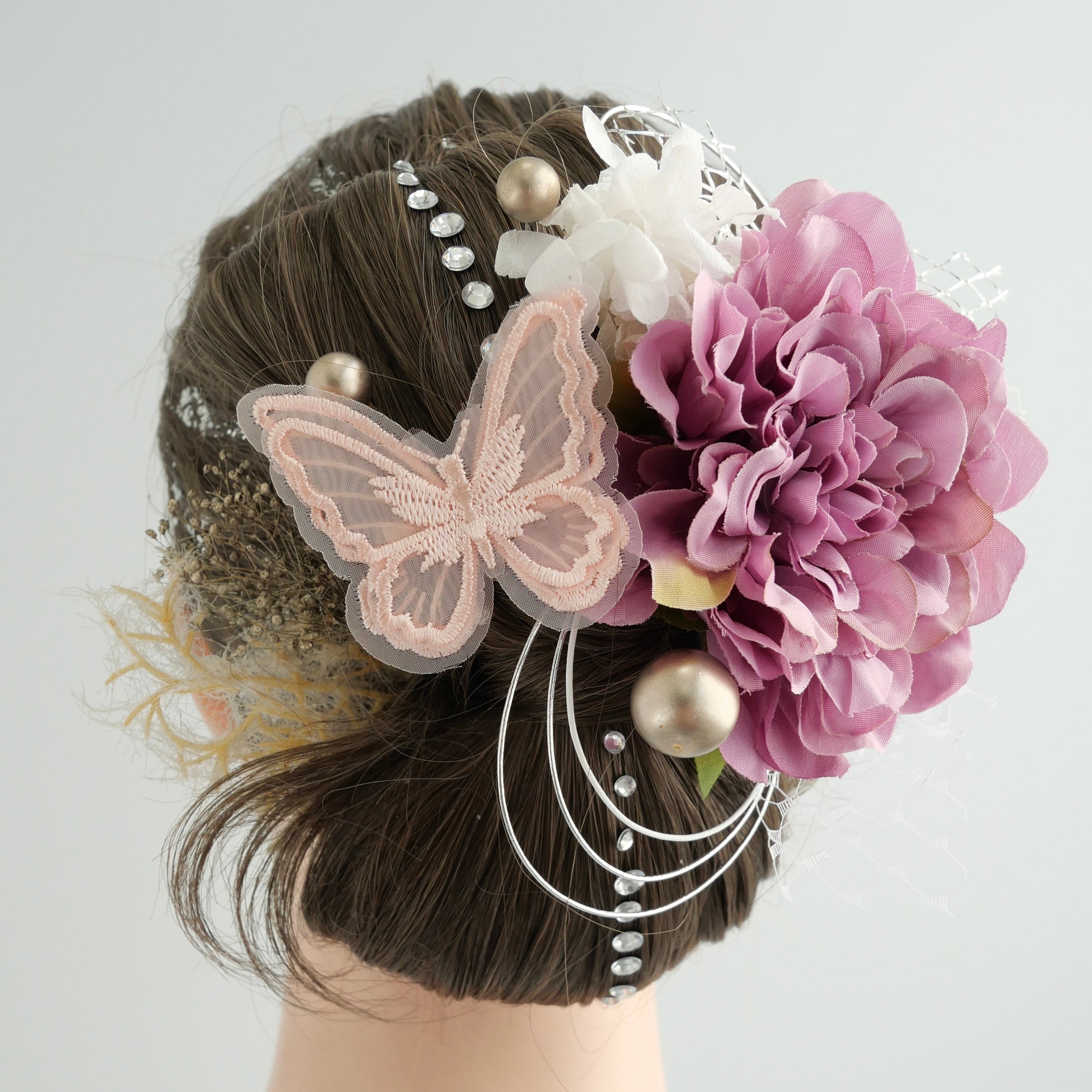 インパクトあるダリアと蝶々やラインストーンを組み合わせた華やかな髪飾りセット。