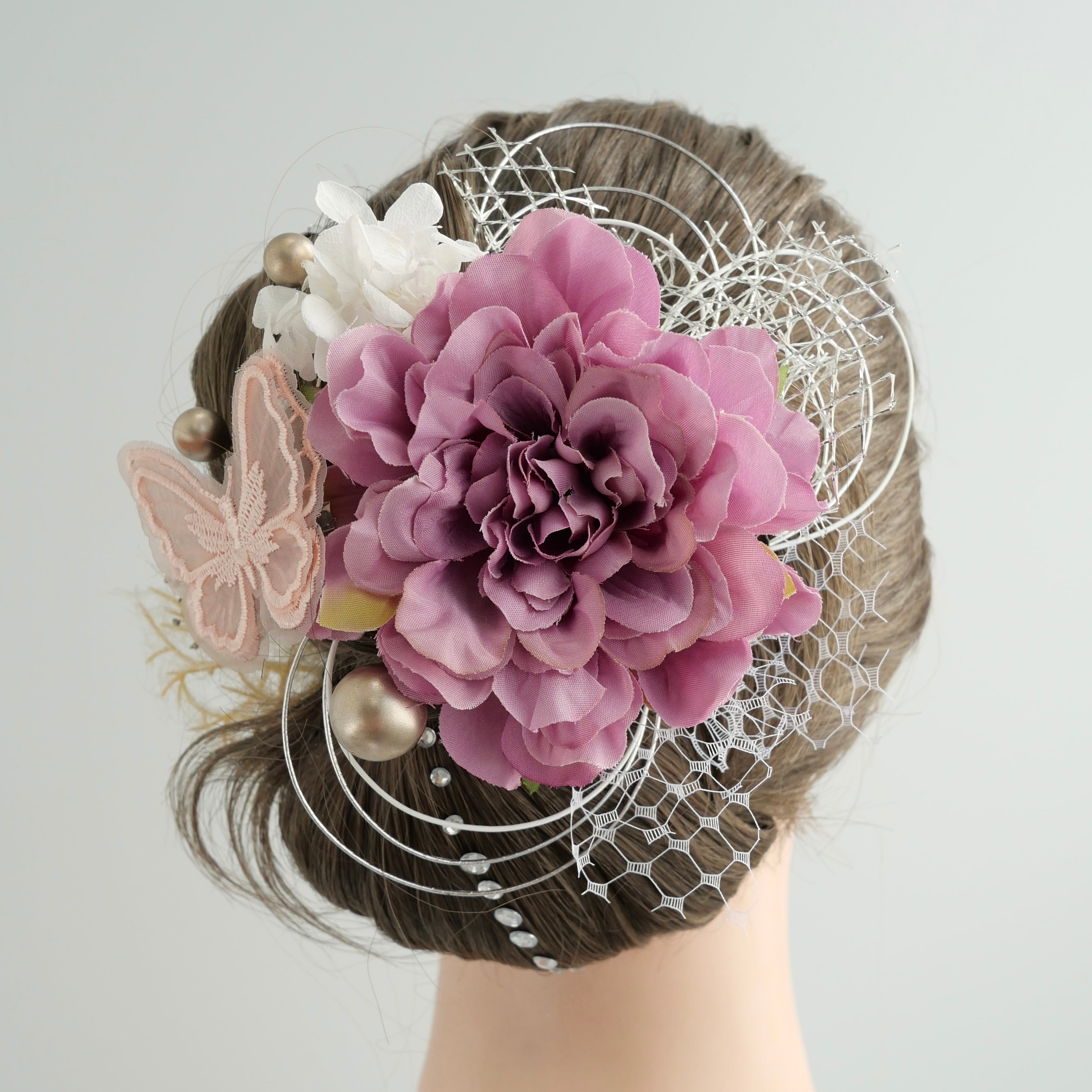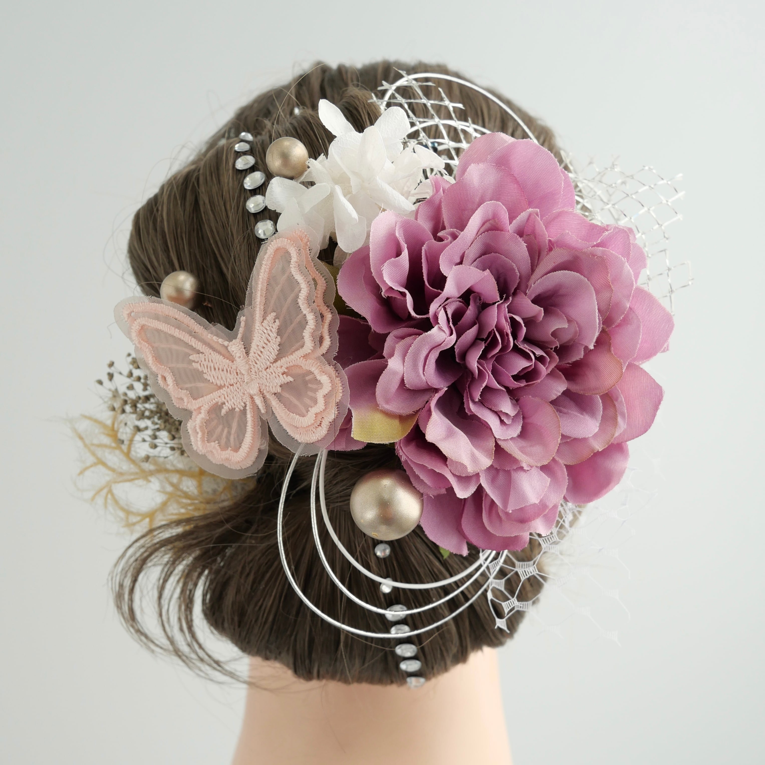 A593 紫ダリアと蝶の髪飾り 浴衣 成人式 卒業式 前撮り 結婚式 水引