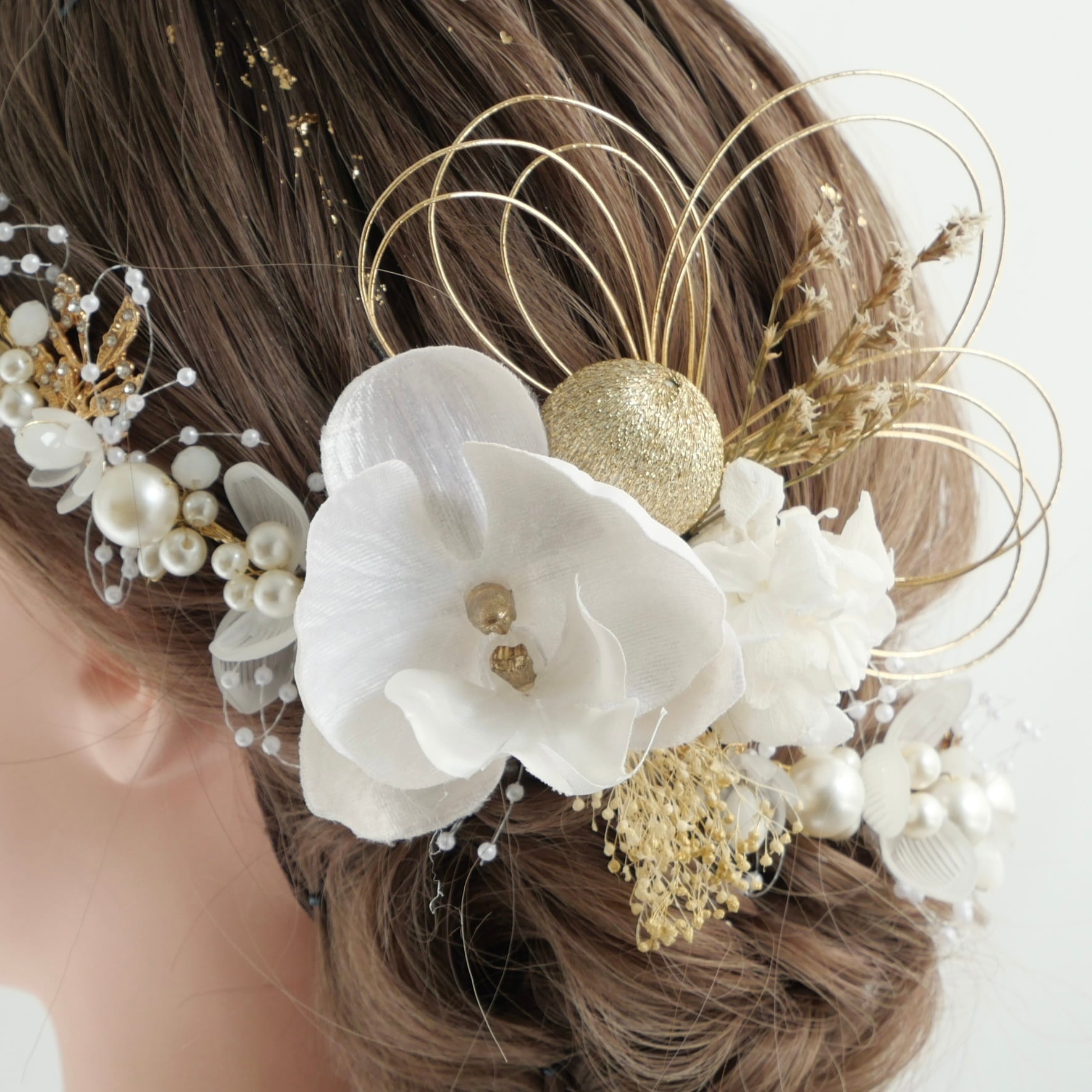 A597 パールカチューシャ 胡蝶蘭 白ゴールド 髪飾り 浴衣 成人式 卒業式 前撮り 結婚式 水引