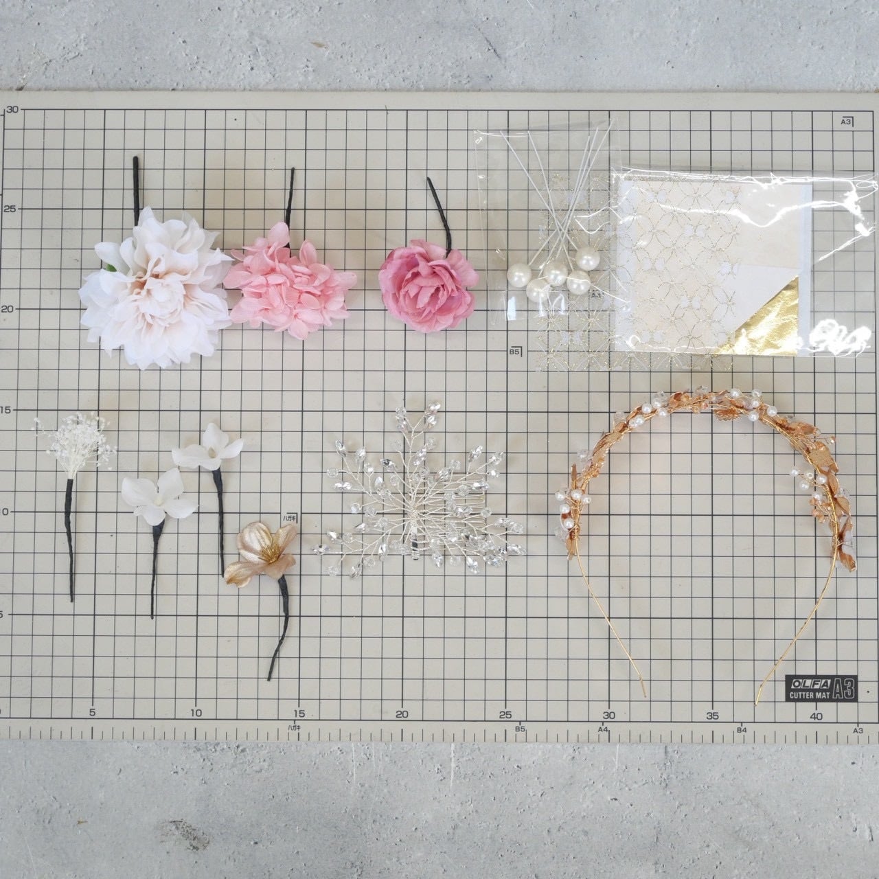 キラキラのストーンアクセサリーを中心に、繊細なレースやパール、ピンクゴールドのカチューシャが存在感たっぷりのデザインです。