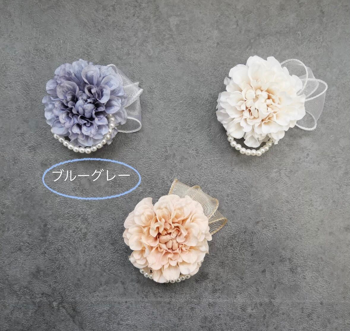 ブルーグレーのダリアを基調に、艶めくパールにリボンを合わせシンプルかつ上品なデザインに仕上げました。