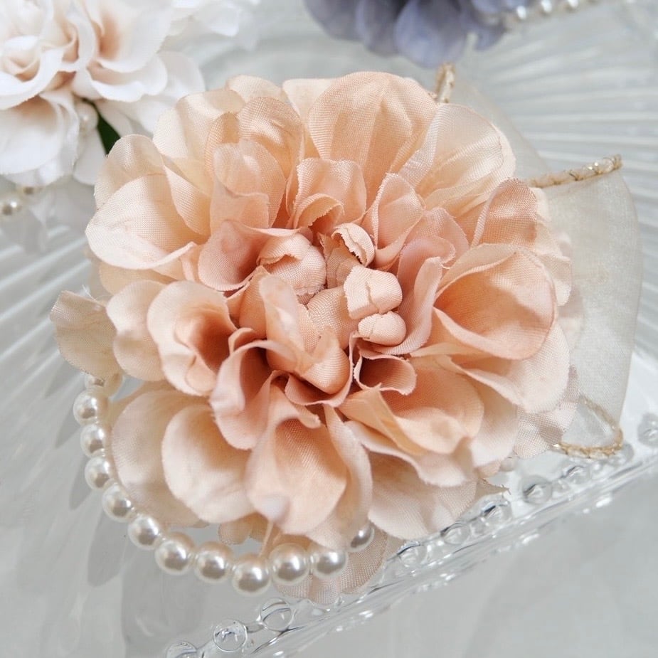 ピンクベージュ《大人ピンク》のダリアを基調に、パールとリボンを合わせシンプルかつ上品なデザインに仕上げました。