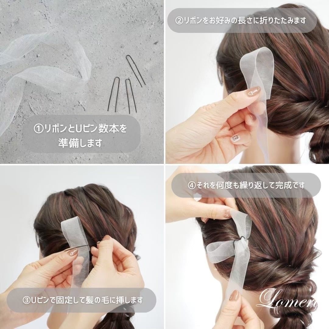 写真のヘアスタイルでは、1本のリボンをピンで留めながらつけています。