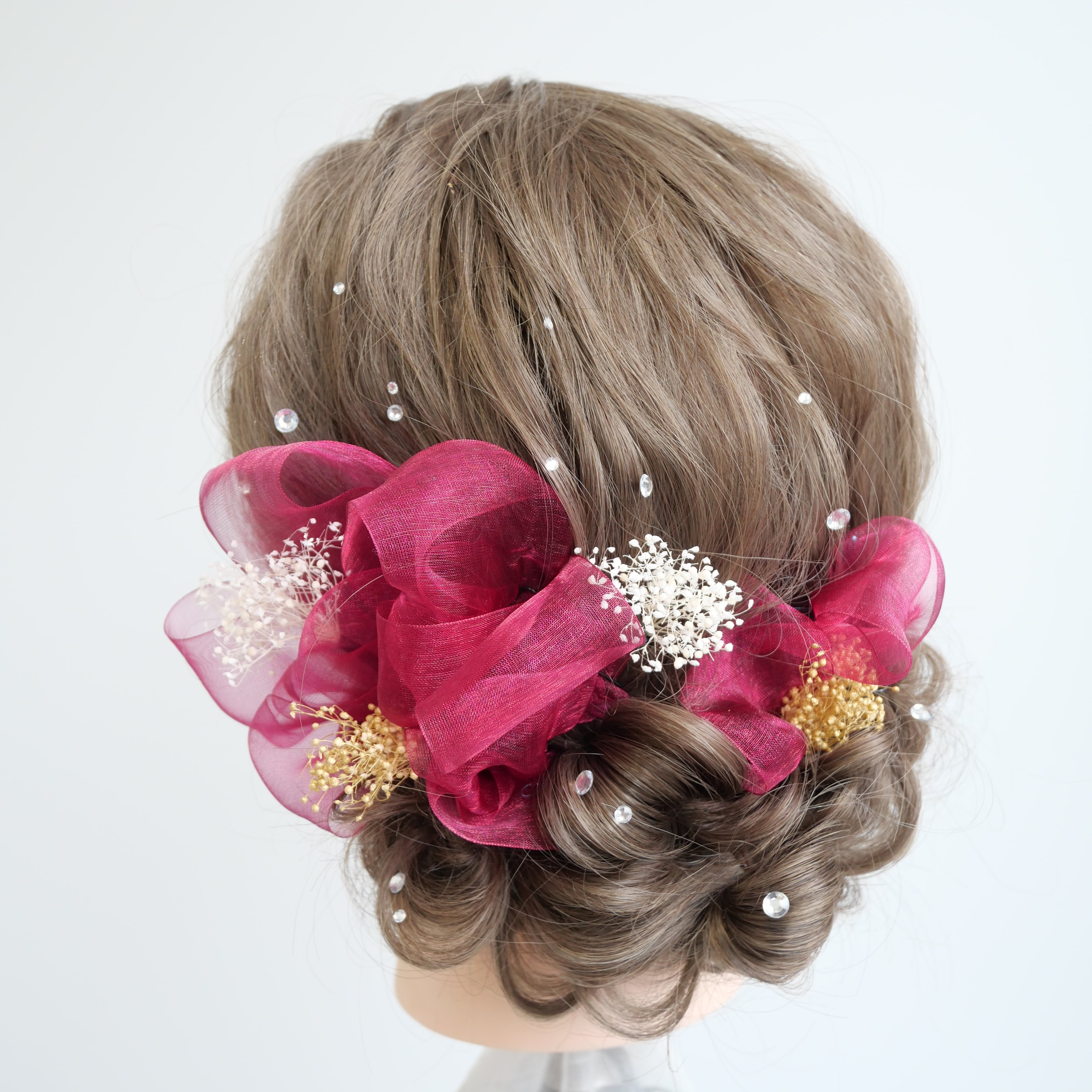 A606 ピンクオーガンジーリボンとラインストーンの髪飾り 成人式 前撮りヘア 結婚式 リボンアレンジ