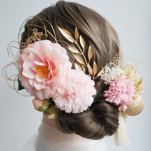 柔らかなピンクと白の花を基調に、ゴールドのリーフとベージュのパーツが優しい印象を演出。
