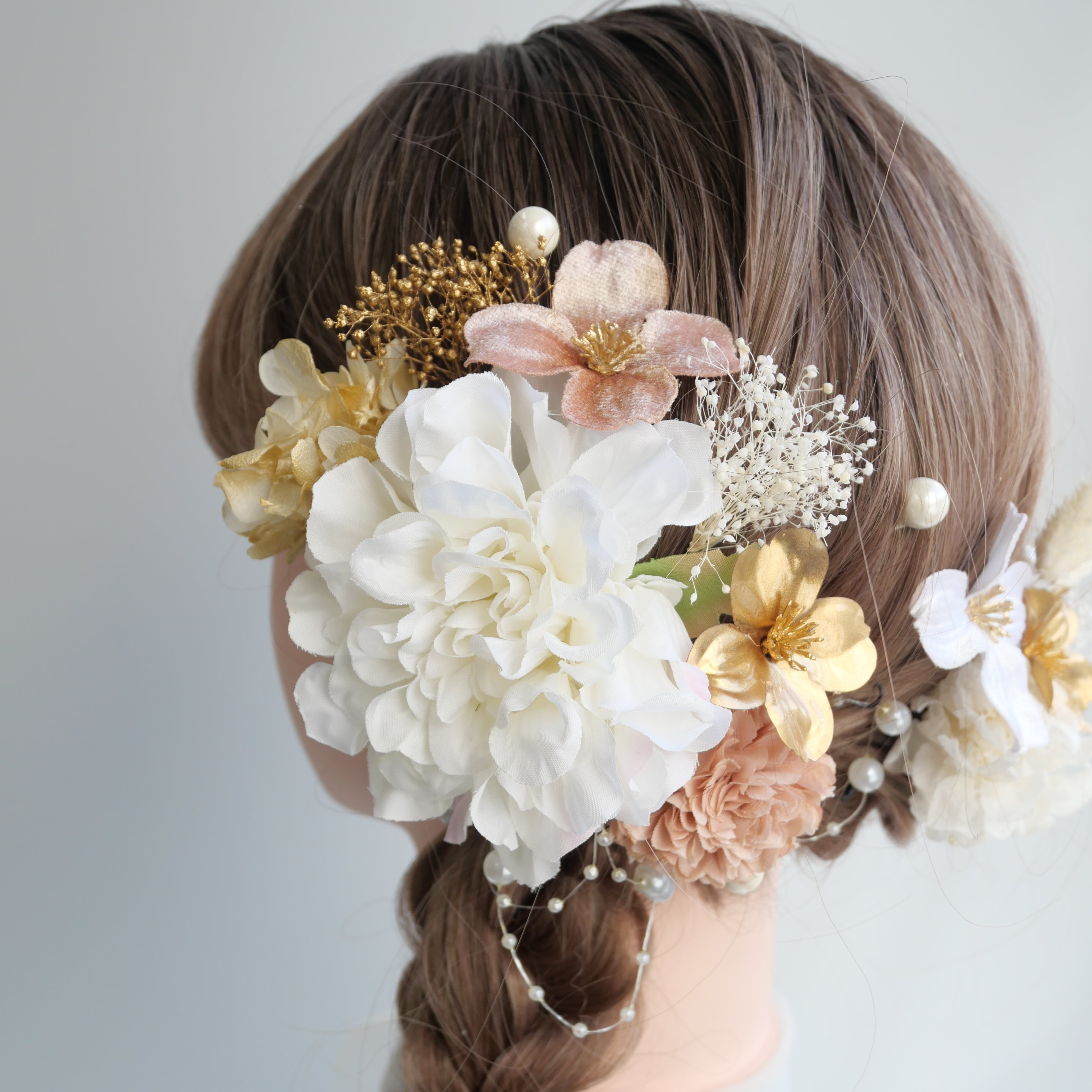 大ぶりのホワイトフラワーが顔まわりを明るく見せ、柔らかなベージュやゴールドの小花が、動くたびに繊細な輝きをプラスします。