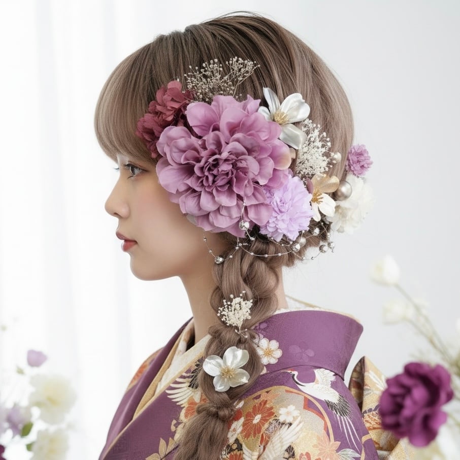 A565 紫 ダリアの髪飾り 成人式 卒業式 前撮り 結婚式 水引