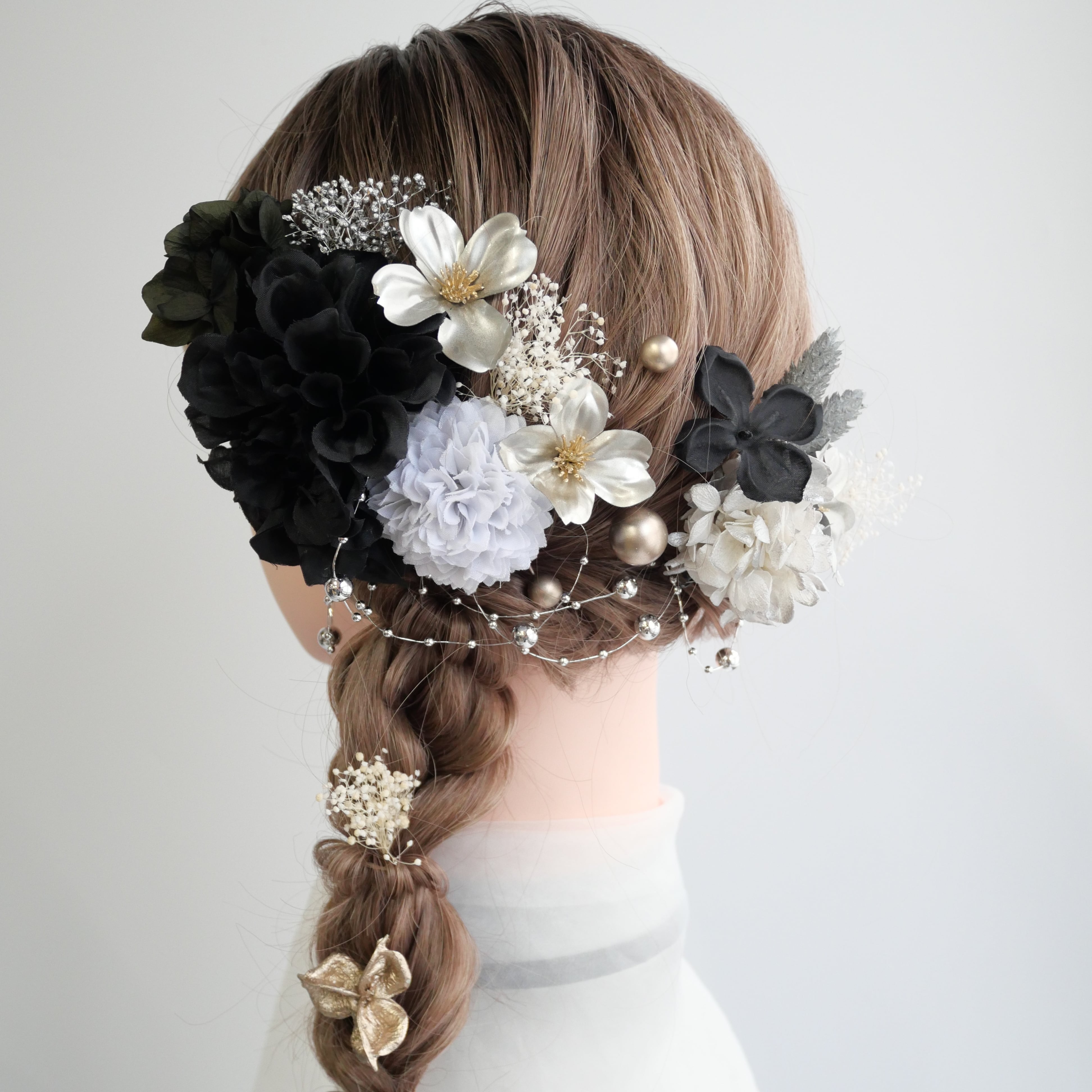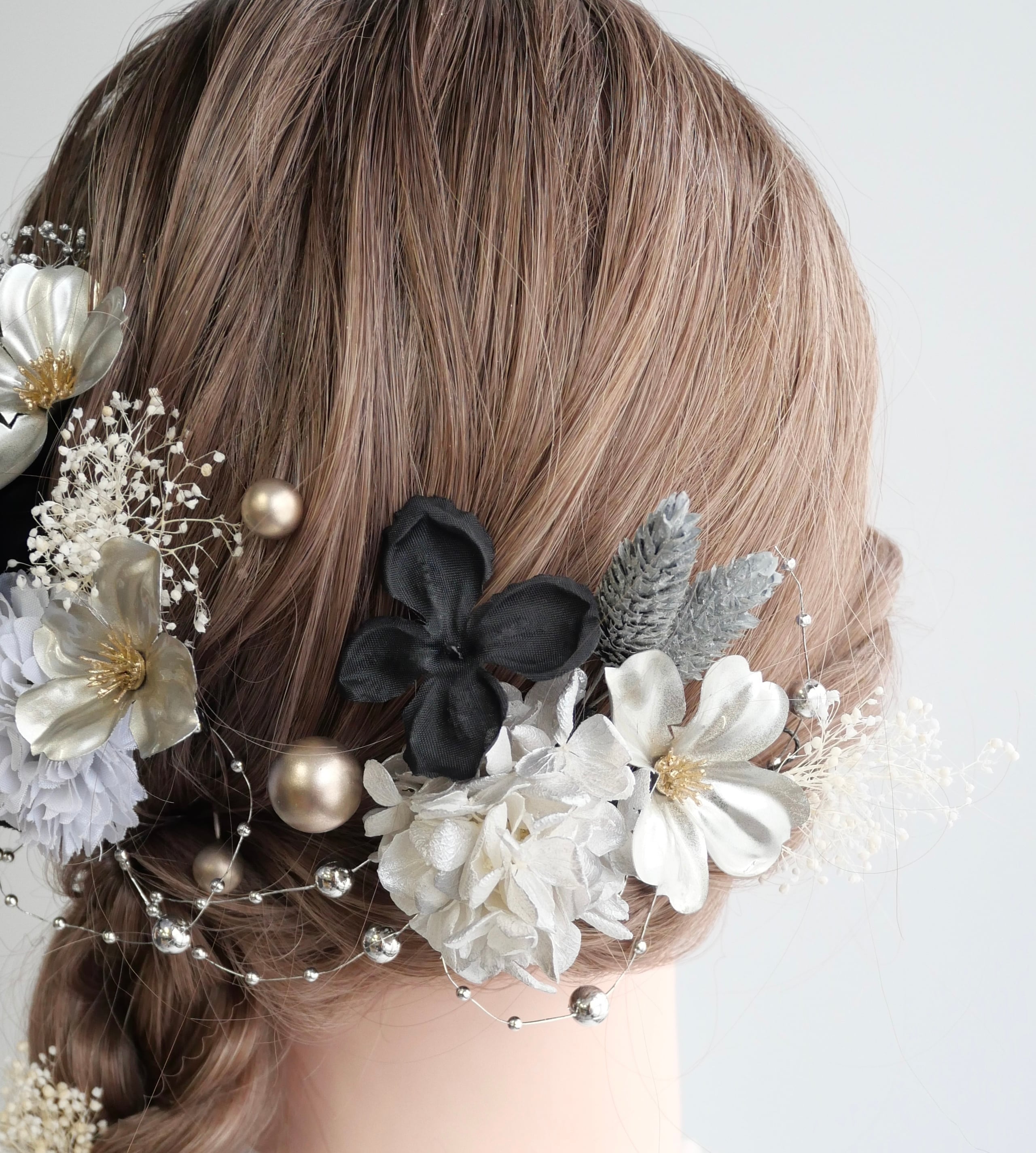 深みのあるブラックに、ホワイトとシルバーを合わせたシックな髪飾り。