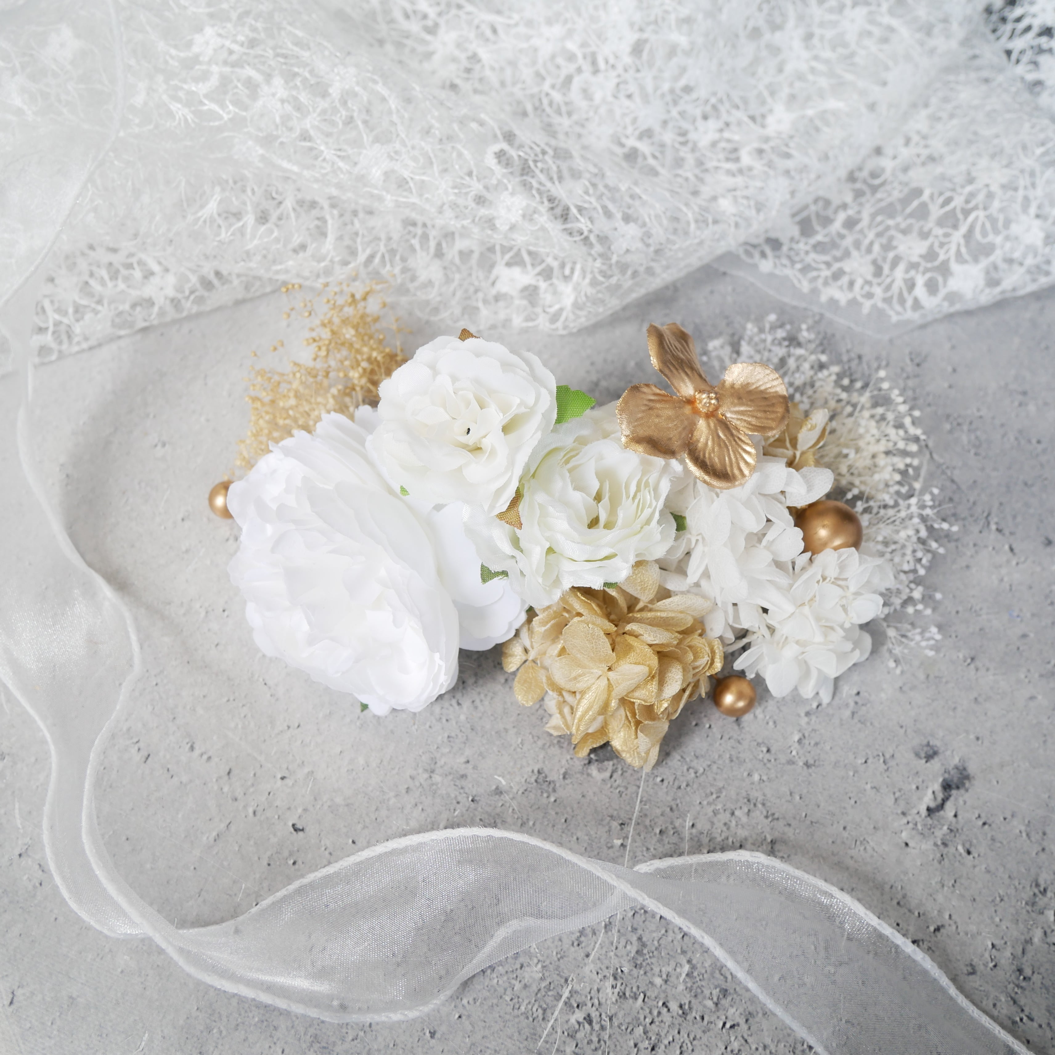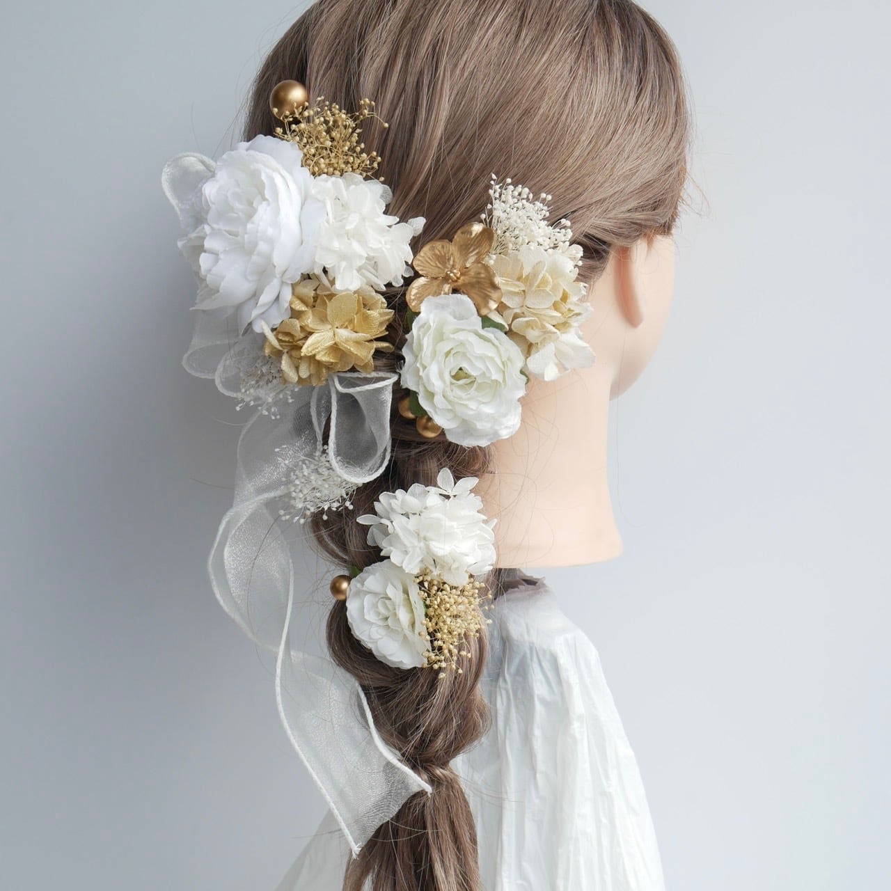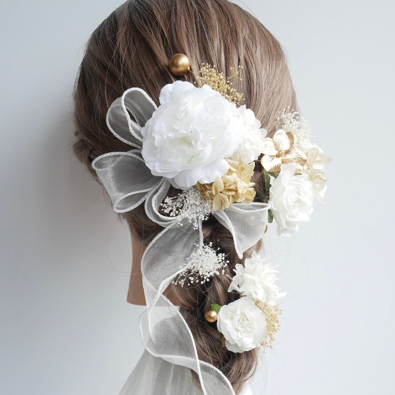 A216 白ゴールド ローズ ドライフラワー髪飾り リボン 卒業式 袴 成人式 振袖 結婚式
