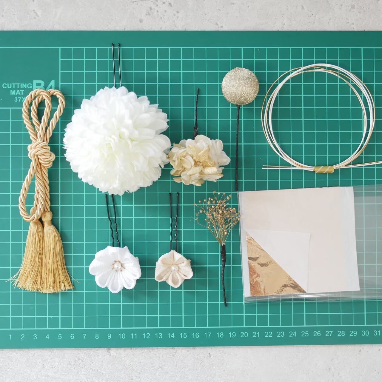 つまみ細工と大きめのマムやドライフラワー、水引を組み合わせたセットです。
