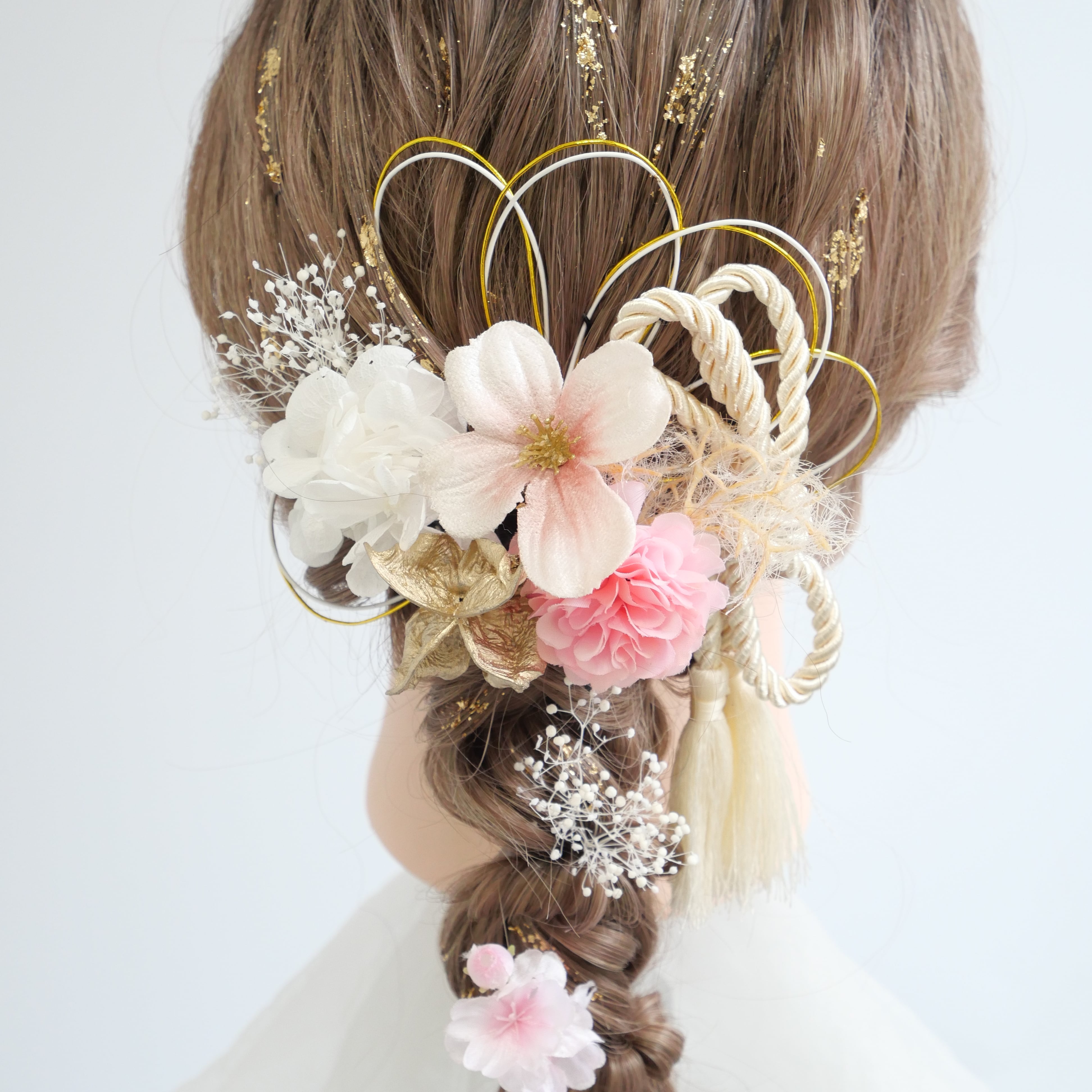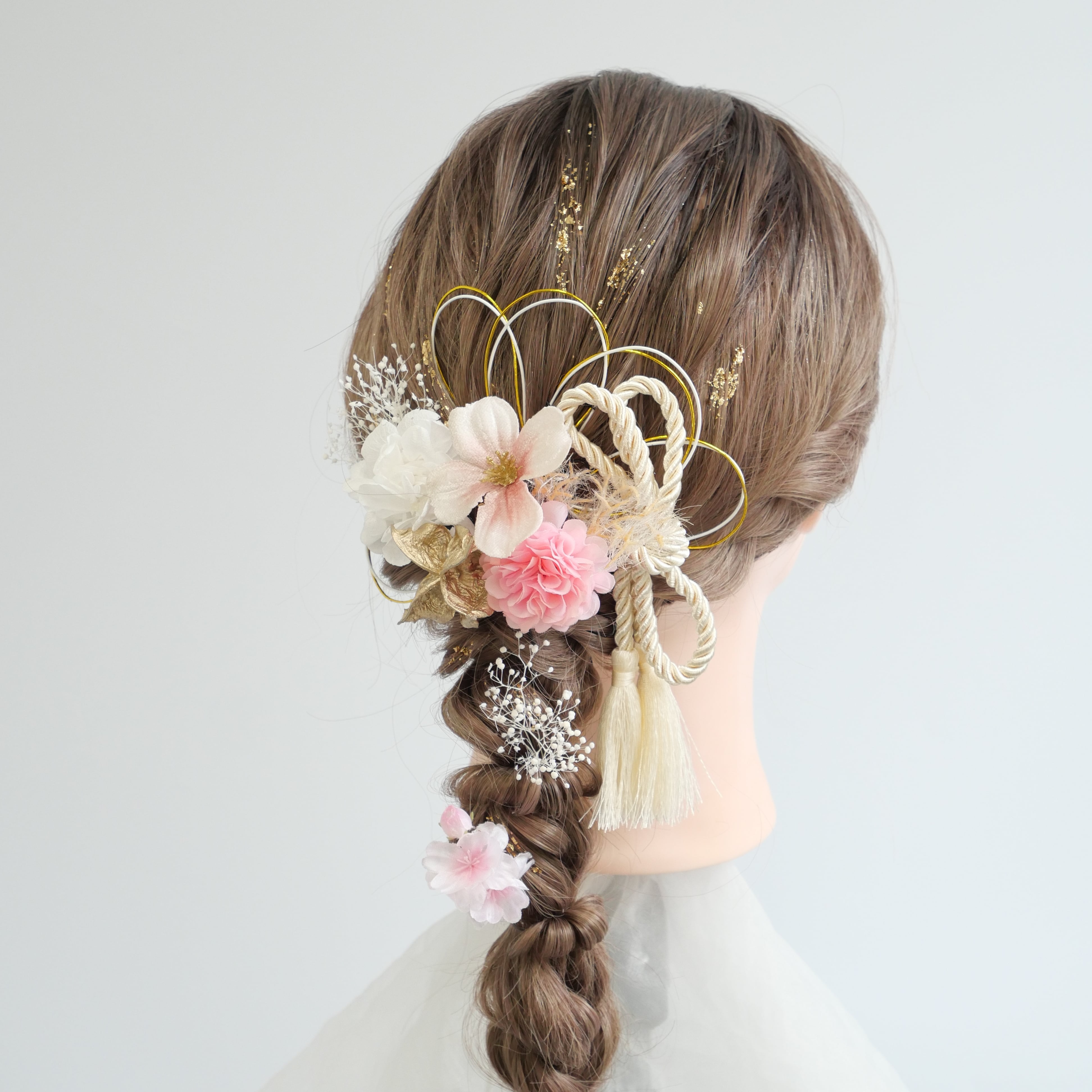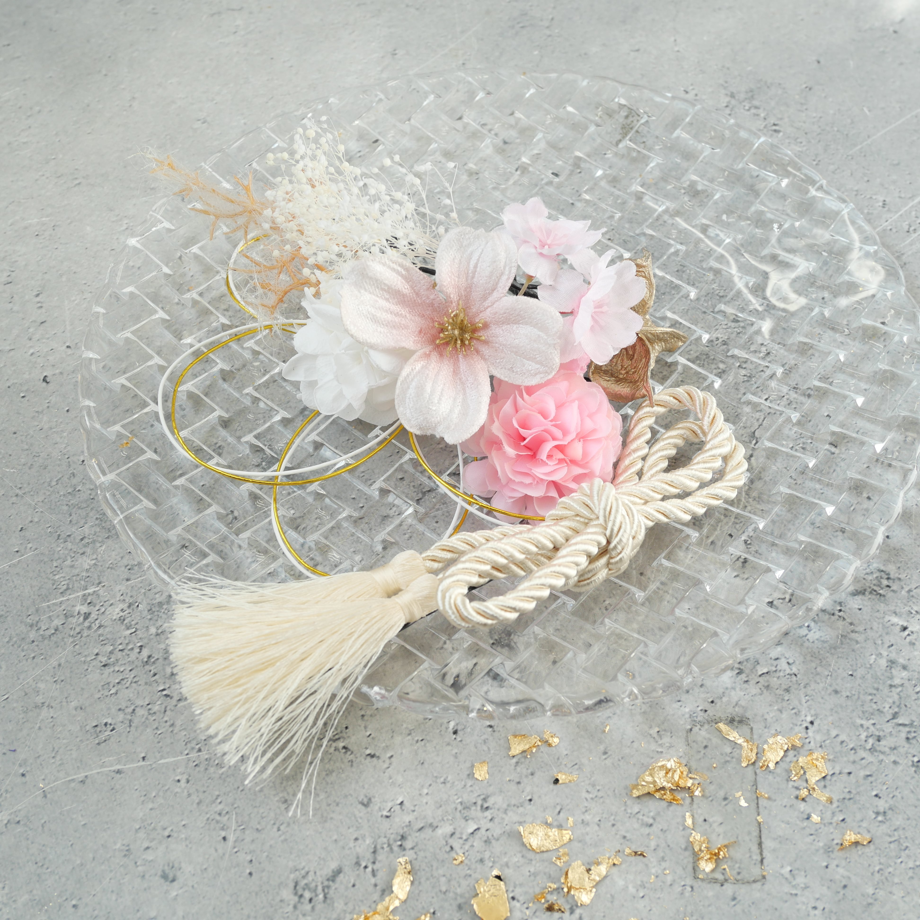 桜 マム かすみ草 カスミソウ かすみそう 紫陽花 アジサイ ゴールド ピンク 白 紐アレンジ 水引アレンジ 金箔アレンジ