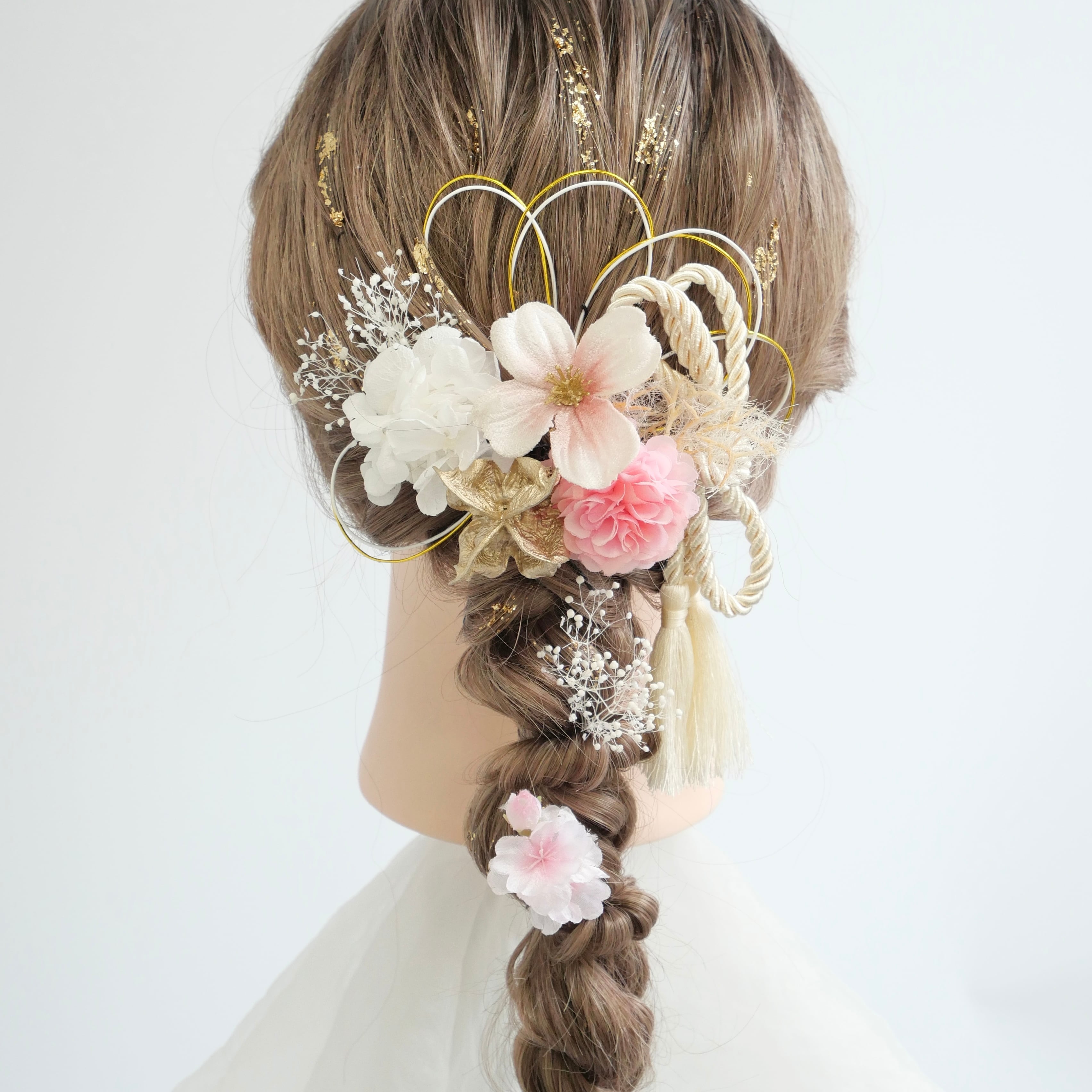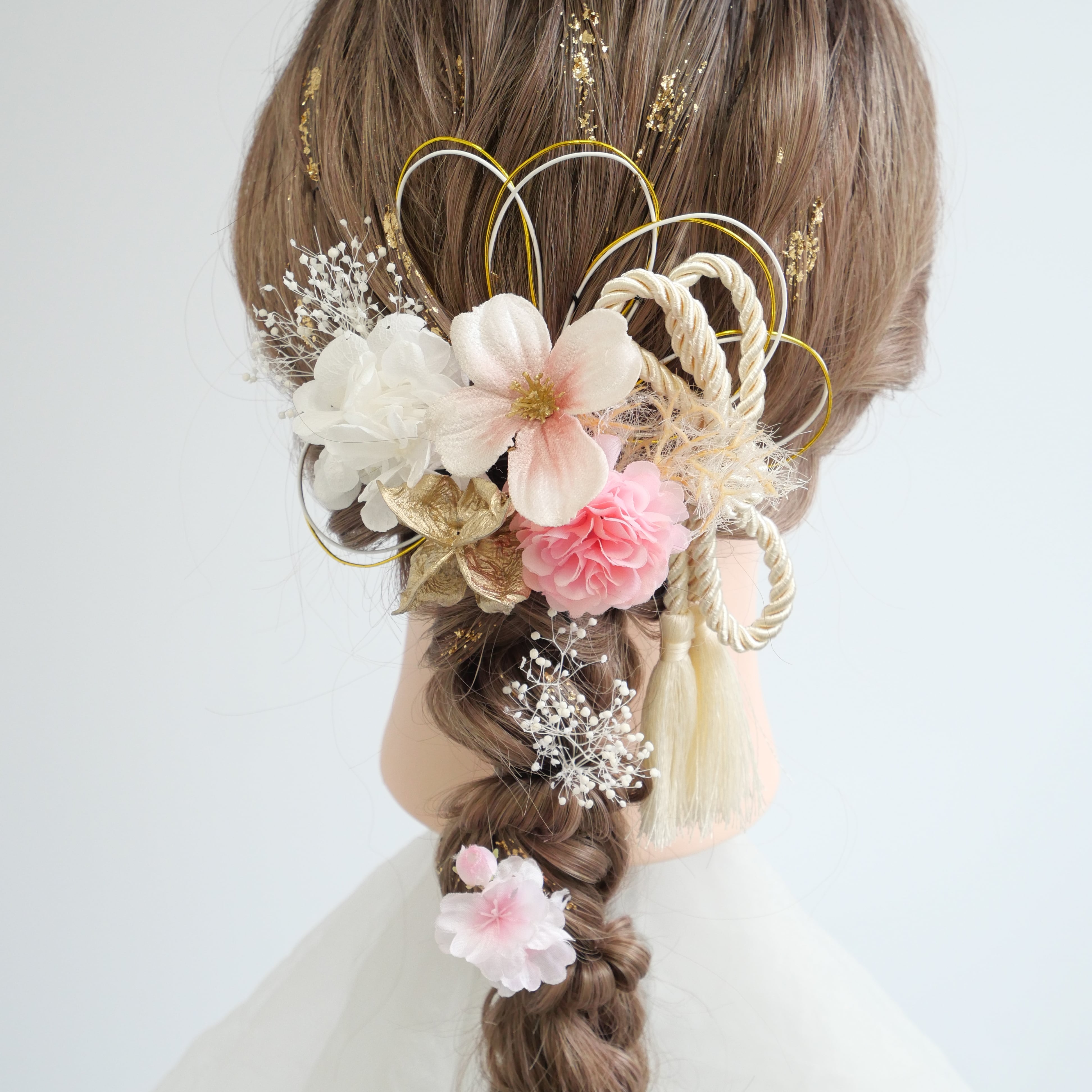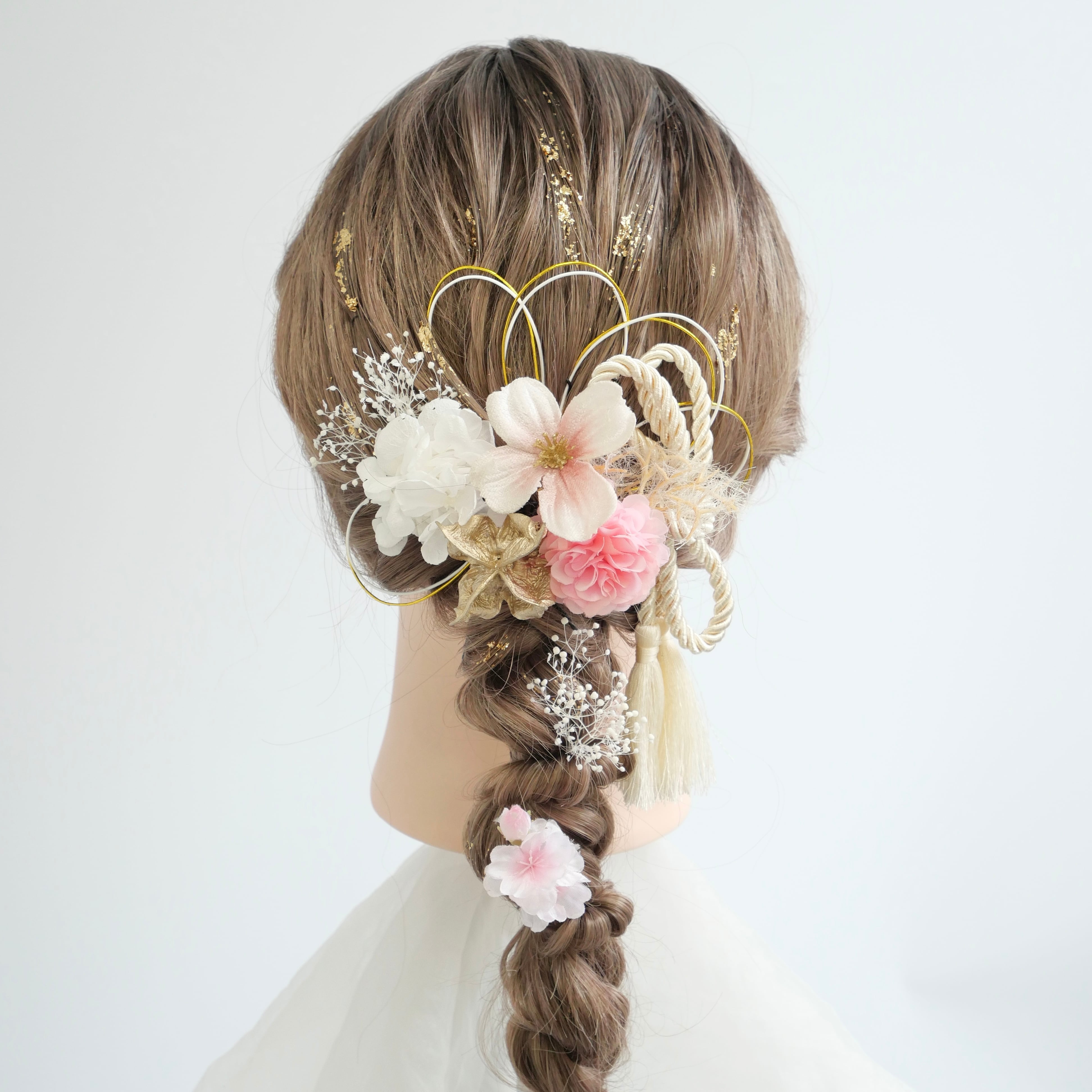 桜 マム かすみ草 カスミソウ かすみそう 紫陽花 アジサイ ゴールド ピンク 白 紐アレンジ 水引アレンジ 金箔アレンジ