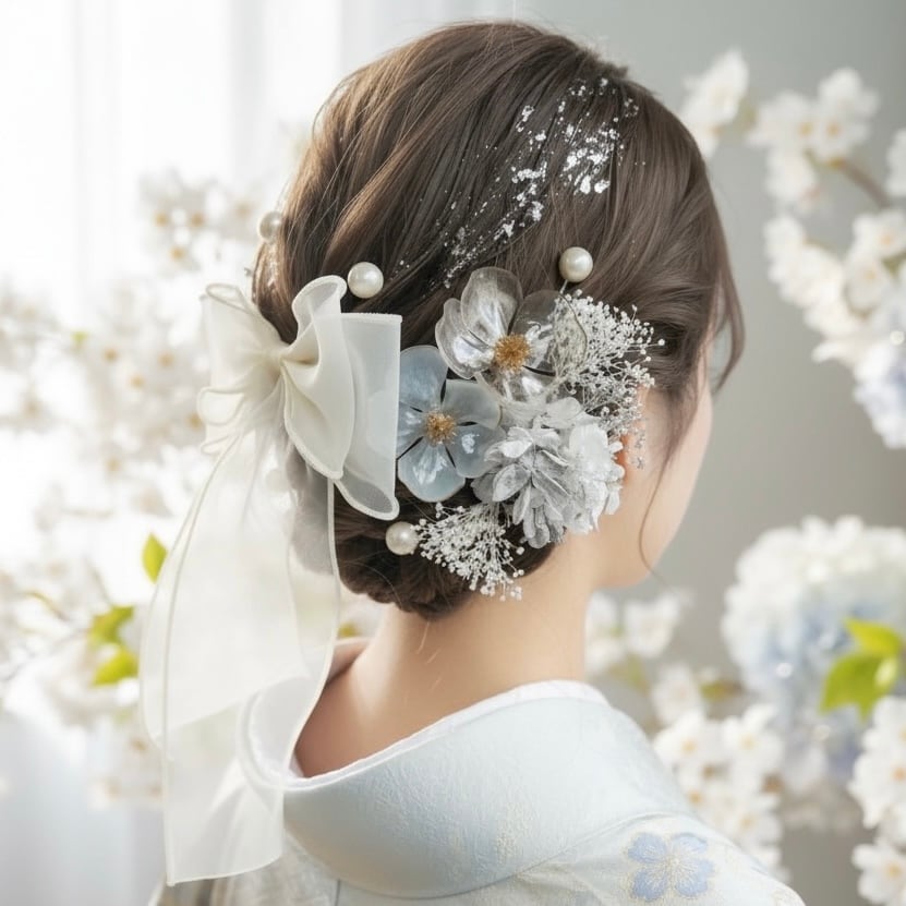 アイボリーカラーのリボンが柔らかさを加え、清楚で上品な後ろ姿を演出します。