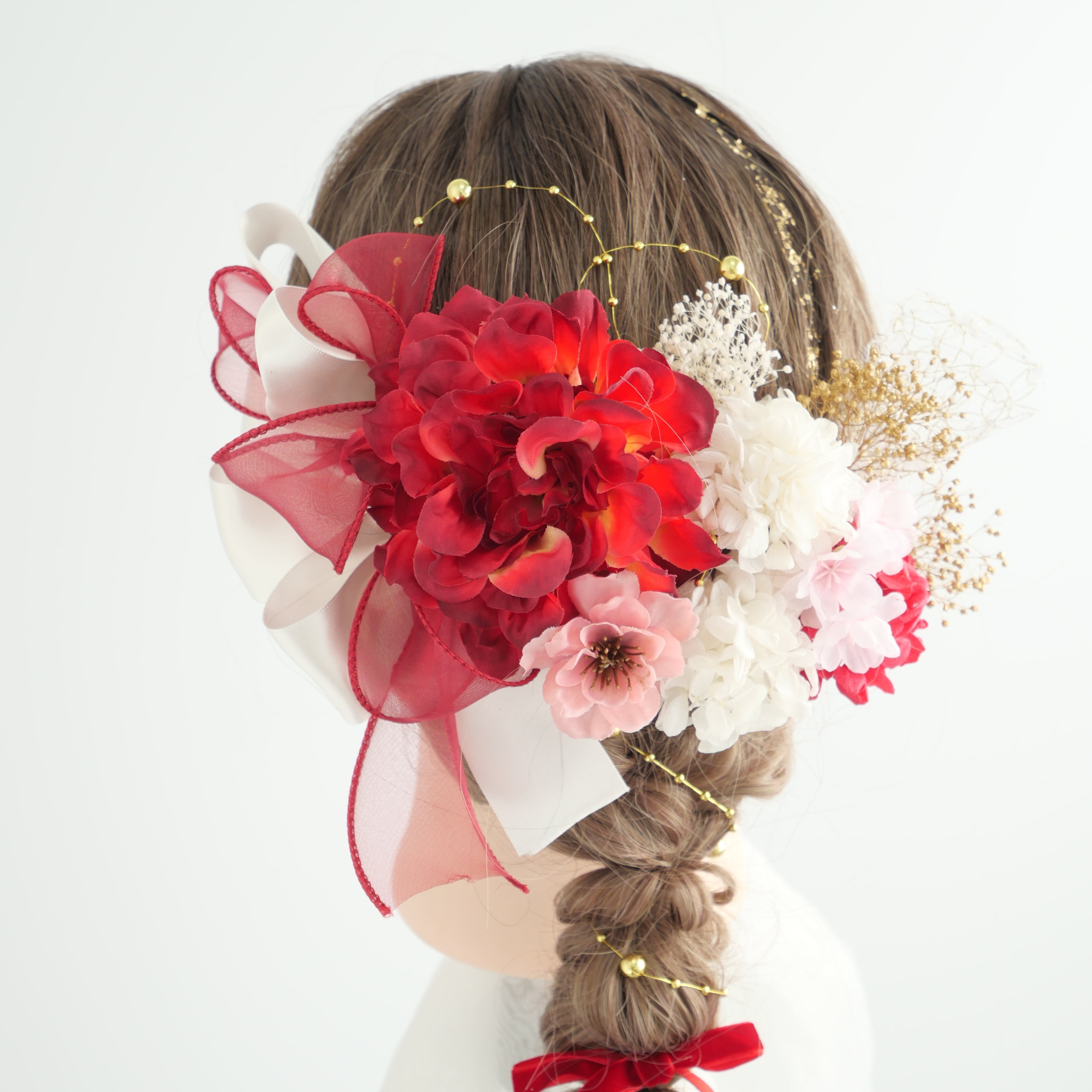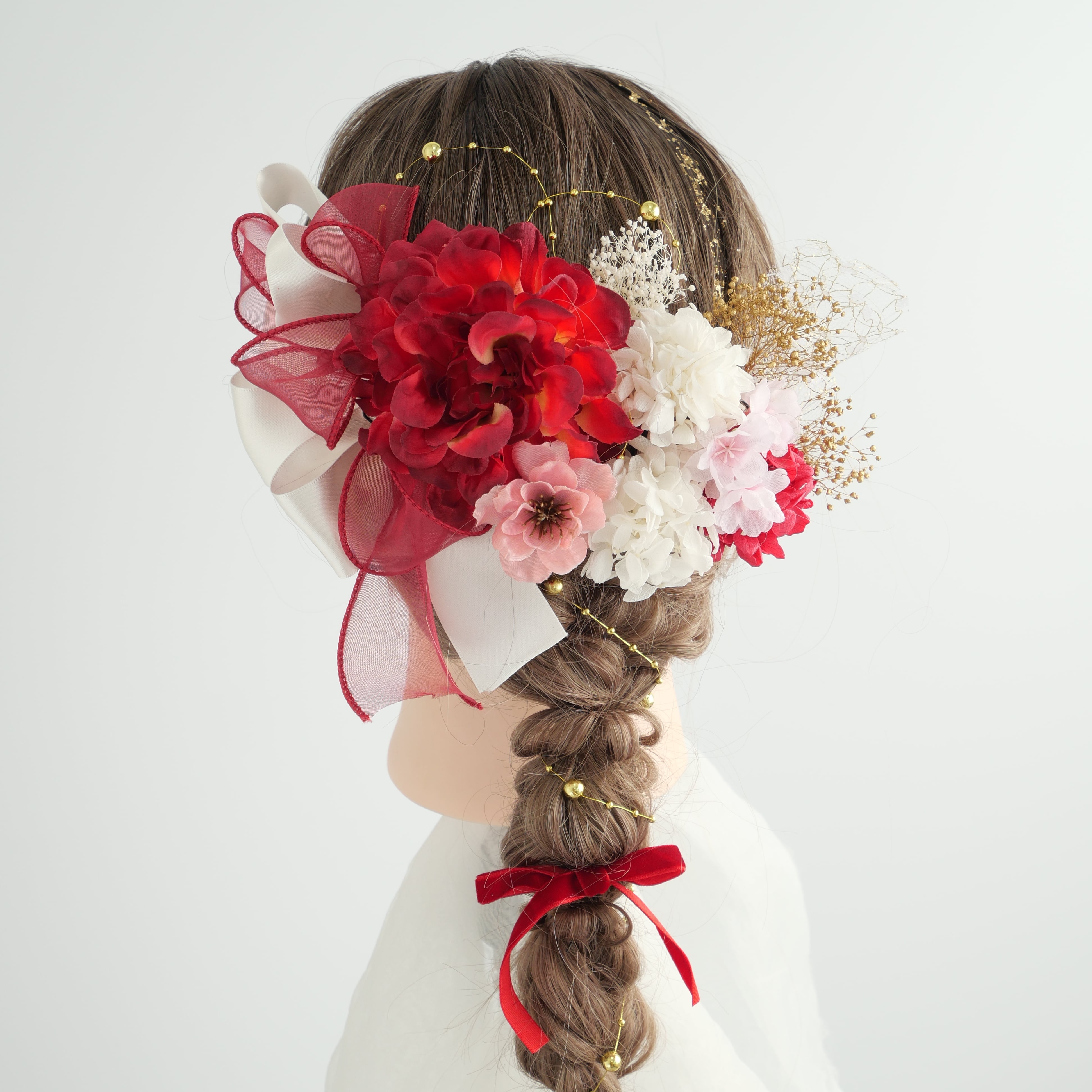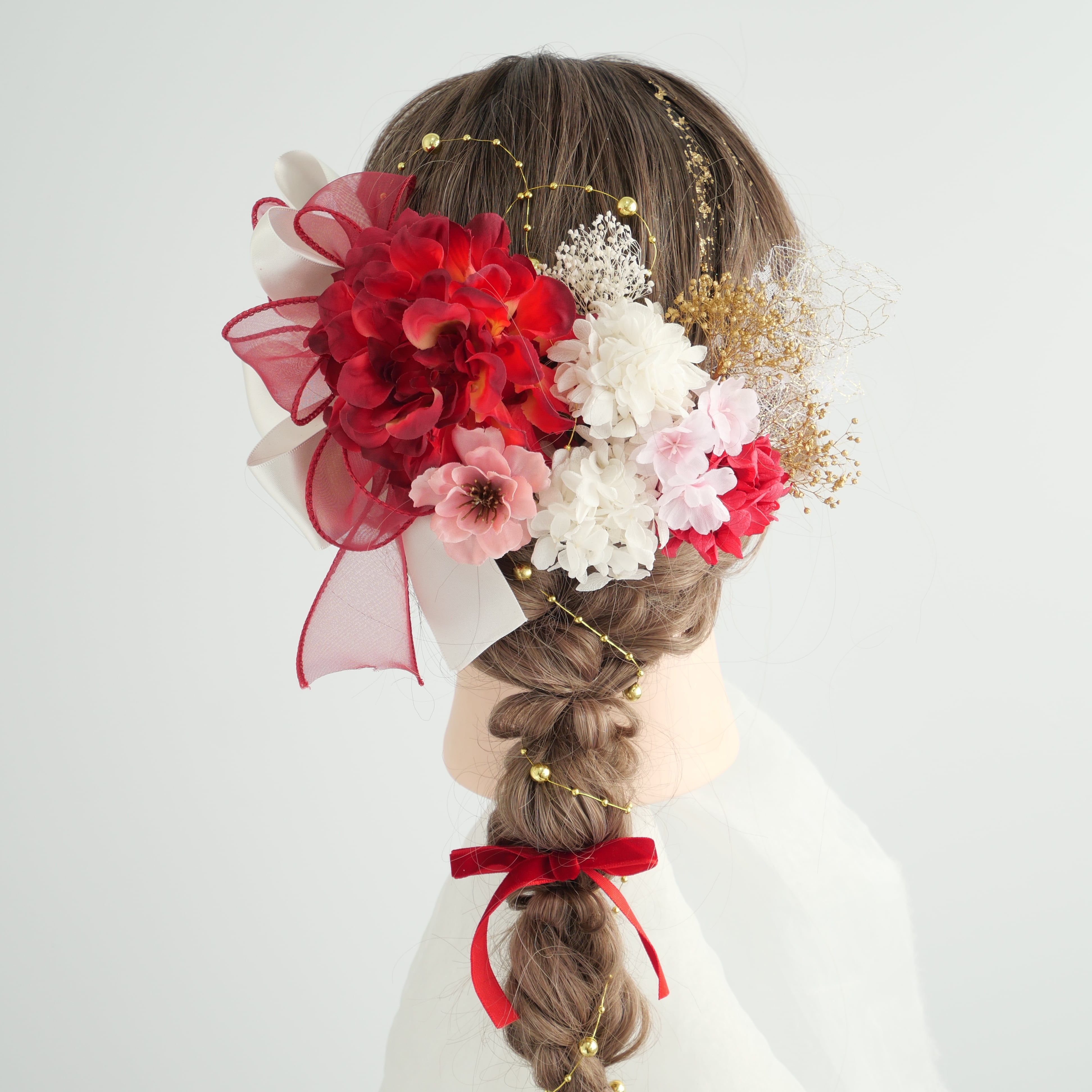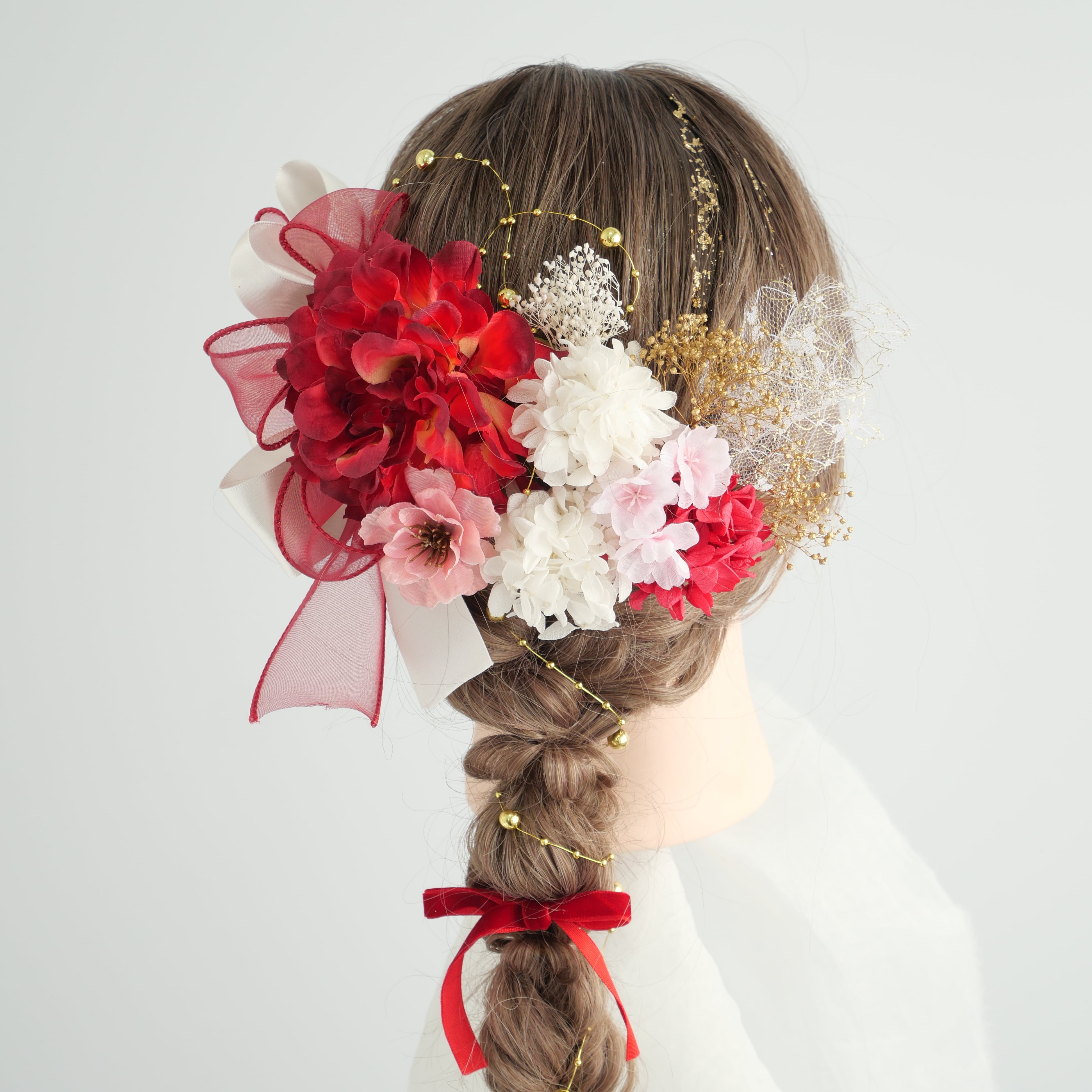 A224 赤 ダリア 桜 さくら リボン アネモネ 髪飾り ドライフラワー パール 成人式 振袖 結婚式 卒業式