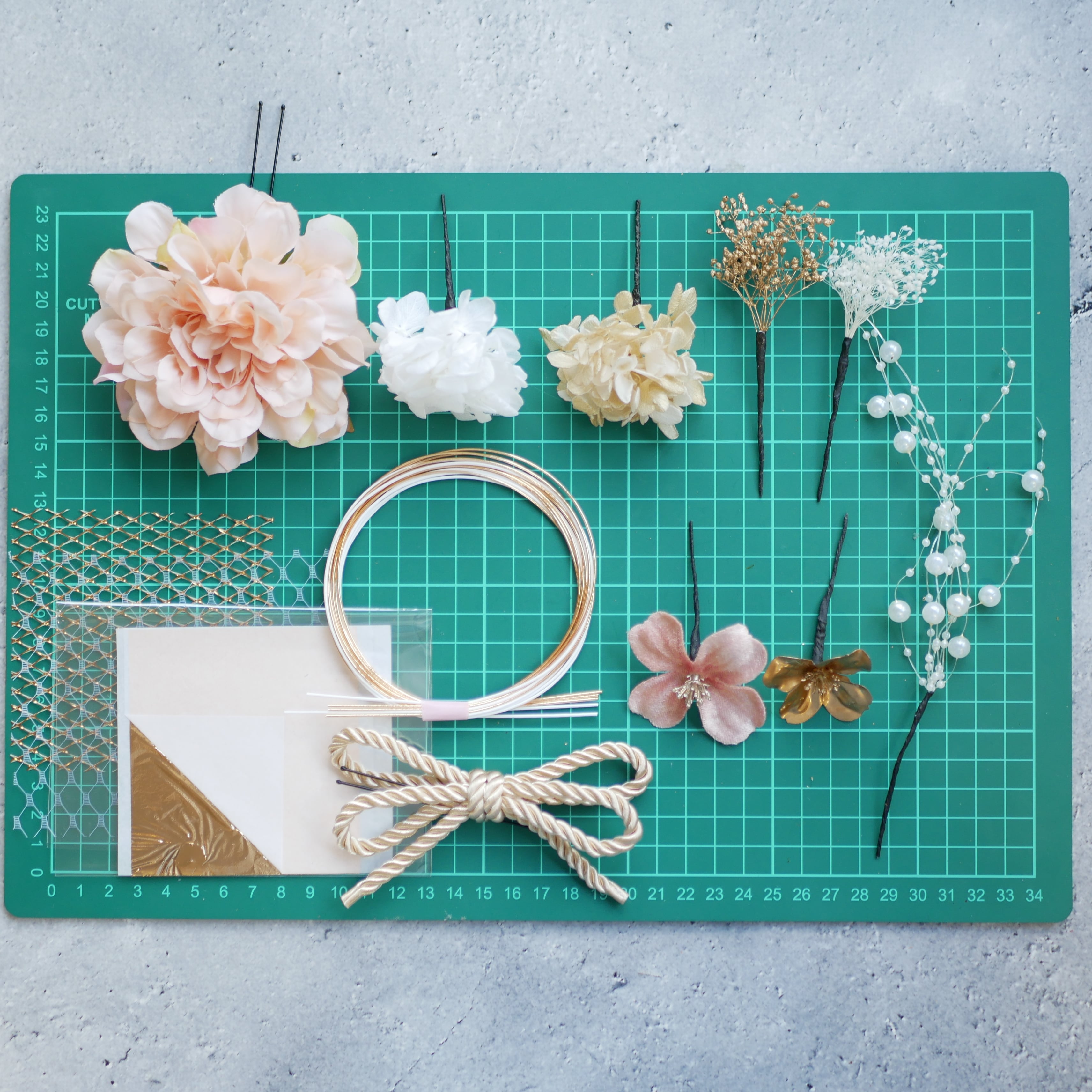 インパクトあるダリアと今季トレンドの、パールシャワーを組み合わせた華やかな髪飾りセット。