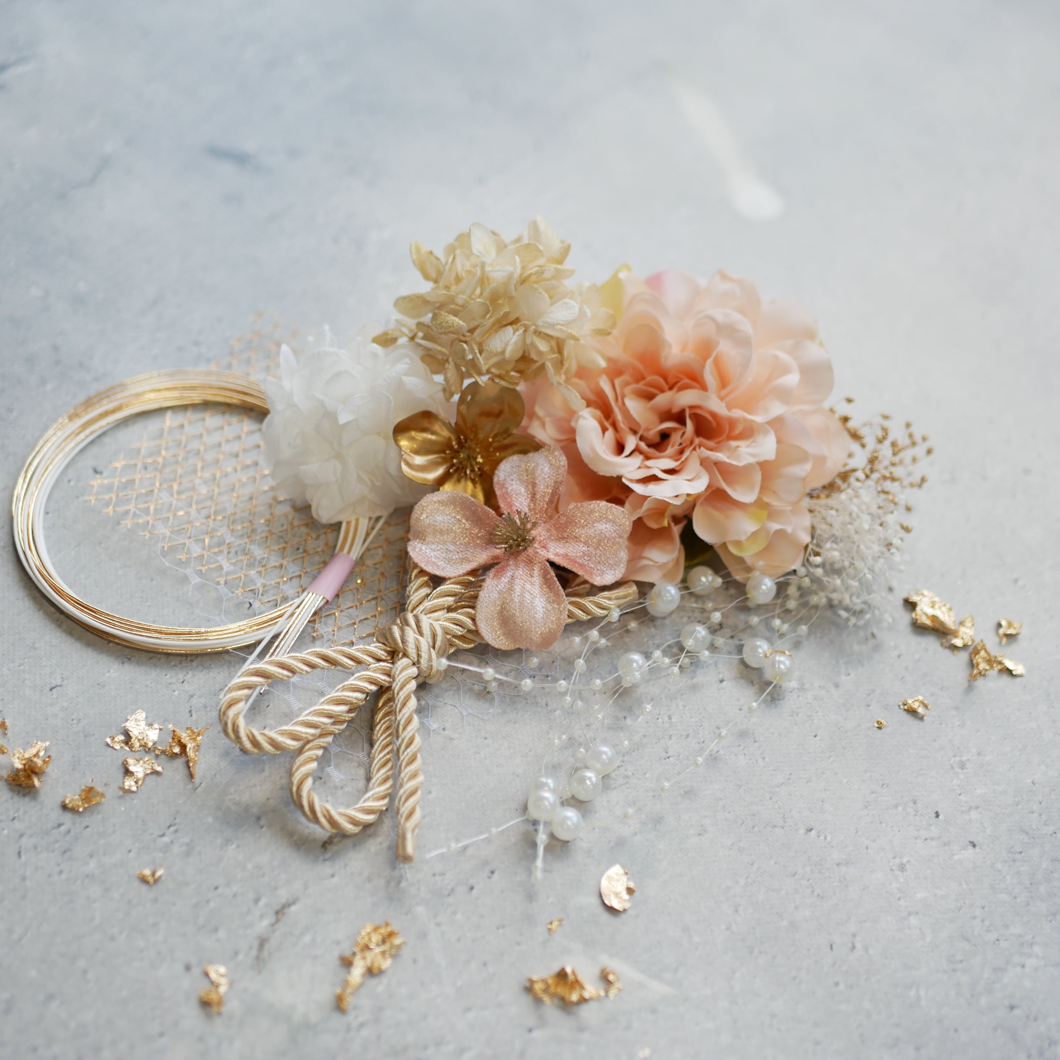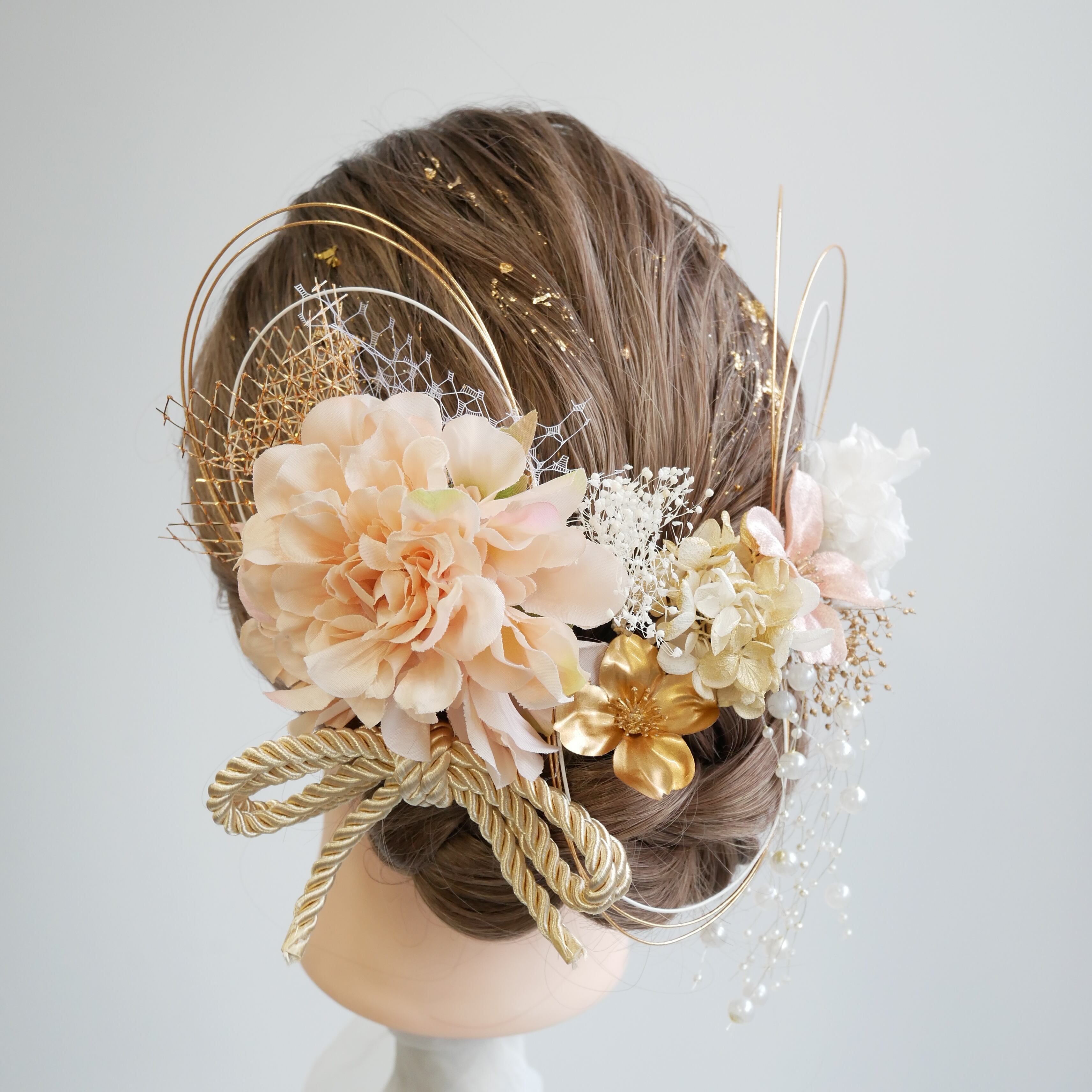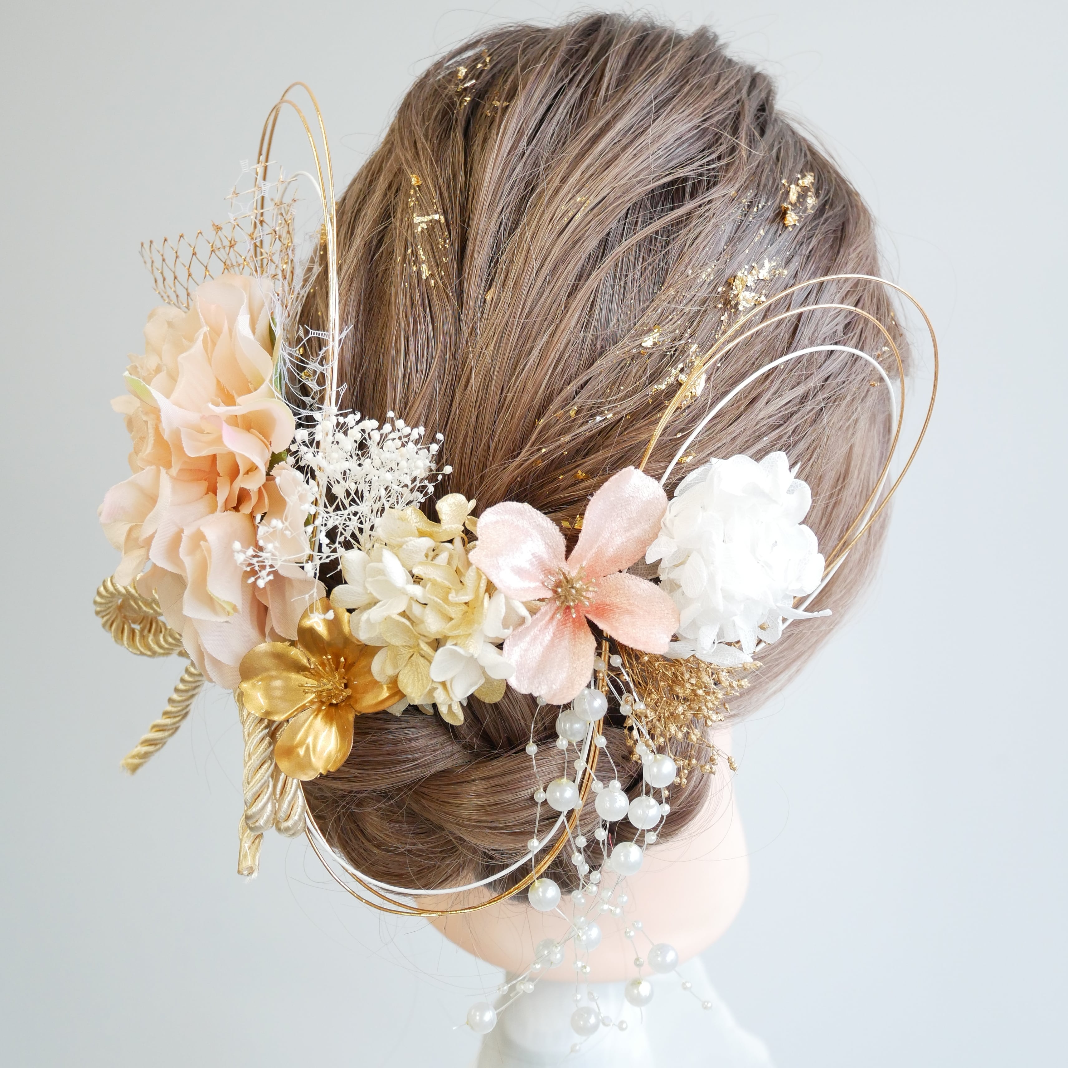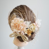 A073 ベージュ ダリアの髪飾り パールシャワー 成人式 卒業式 前撮り 結婚式 水引
