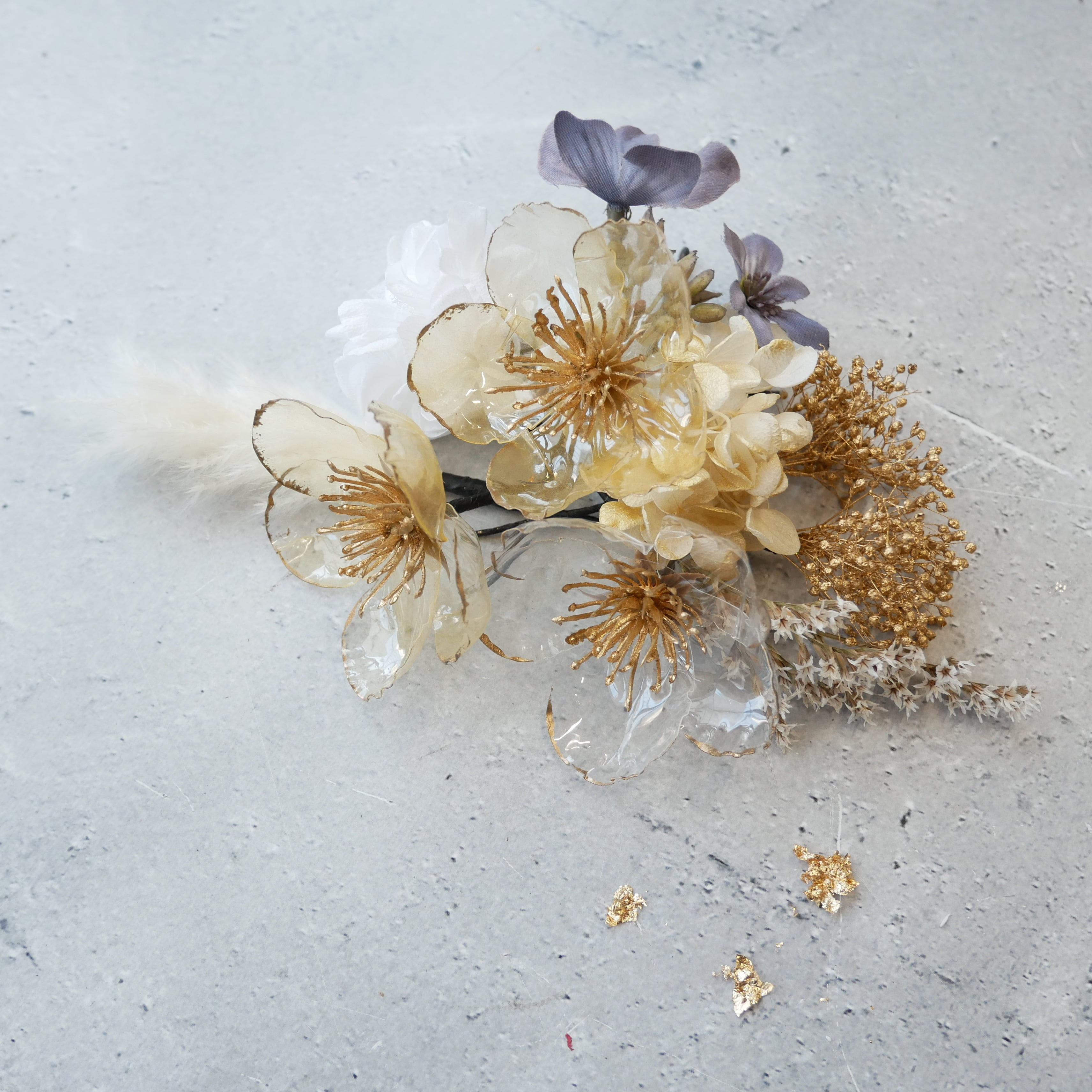 クリアクリスマスローズをメインに合わせた髪飾りのセット。